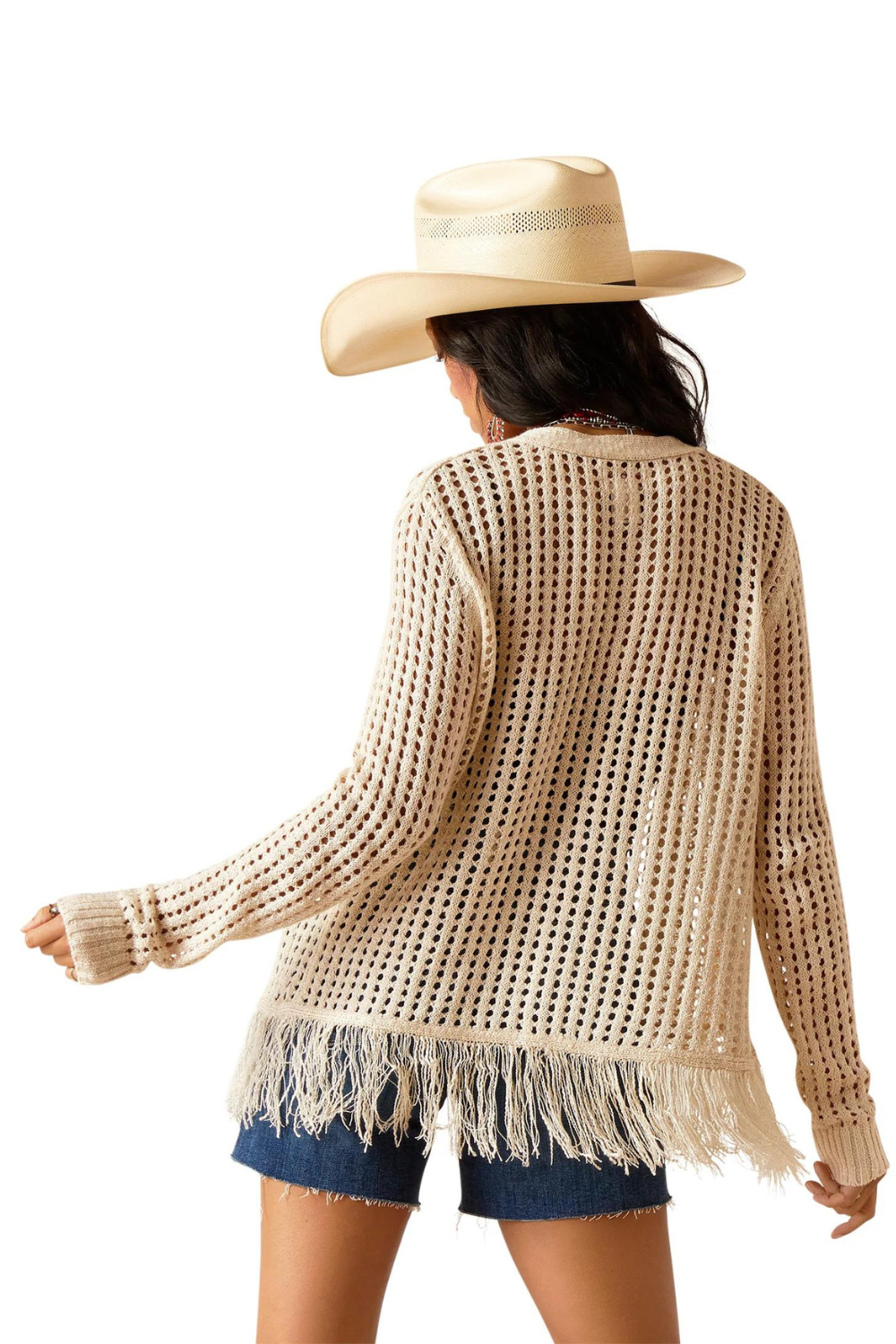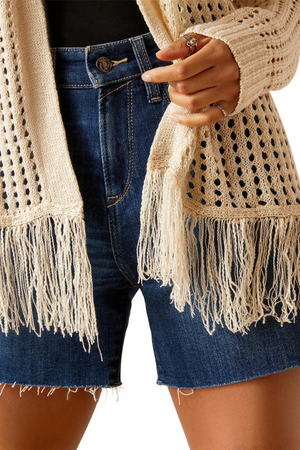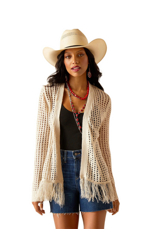 The perfect thing to throw on when it's still a little cool in the evenings. Made of crocheted knit with fringe at the hem for a little Western flair, it elevates any outfit.