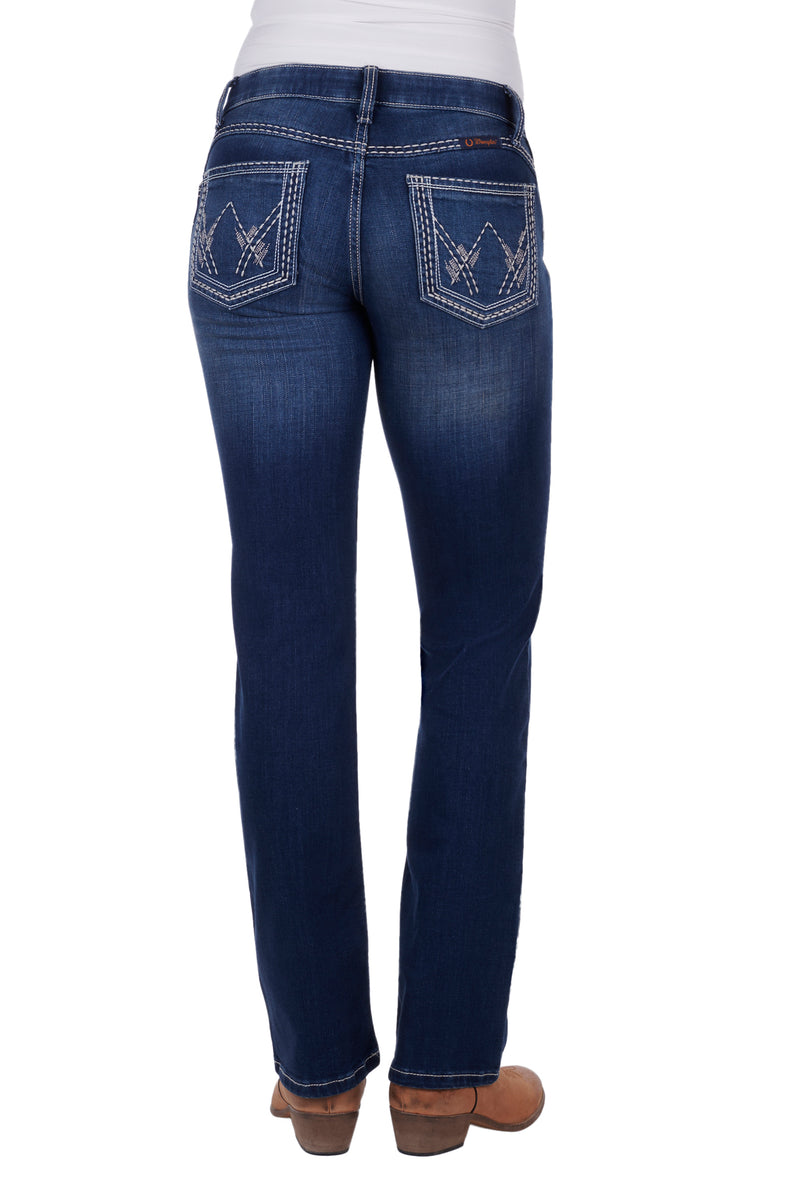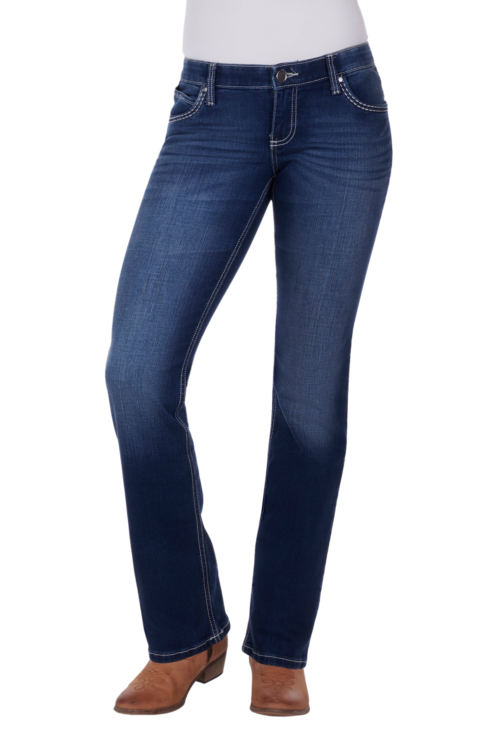 34 Inch Leg, sits above hip, no gap elastic waistband, flat seams, angled patch watch pocket, two front scoop pockets, comfort fit seat and thigh, full flex knee, boot cut.