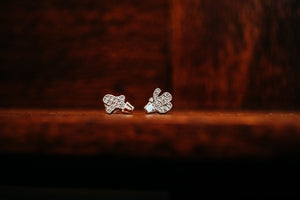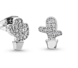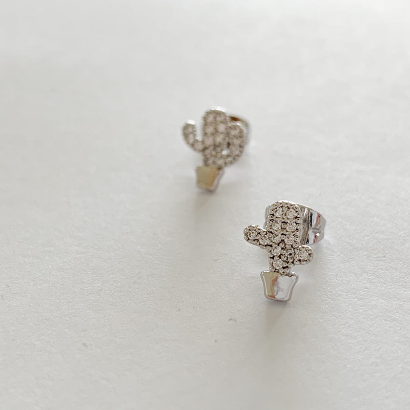 Just because you're small doesn't mean that you can't be tough! These silver toned earrings have distinct cactus shapes, highlighted by the sparkling clear stones set in the main body of each shape. Earring pieces are made to not be identical. Earrings have hypoallergenic stainless steel post backs.