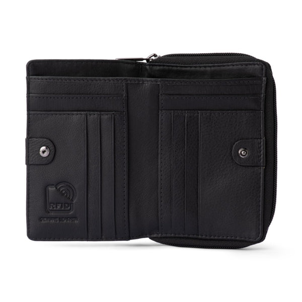 Stay protected with advanced RFID-blocking technology, which helps safeguard your credit cards and personal information from electronic theft. The wallet features a large zip-around coin compartment for easy access and secure storage of your loose change. With ten dedicated card slots, you’ll have plenty of space for all your essential cards, while two compartments behind the card slots provide extra room for receipts or additional items. A full-length currency sleeve keeps your notes organized and easily accessible.