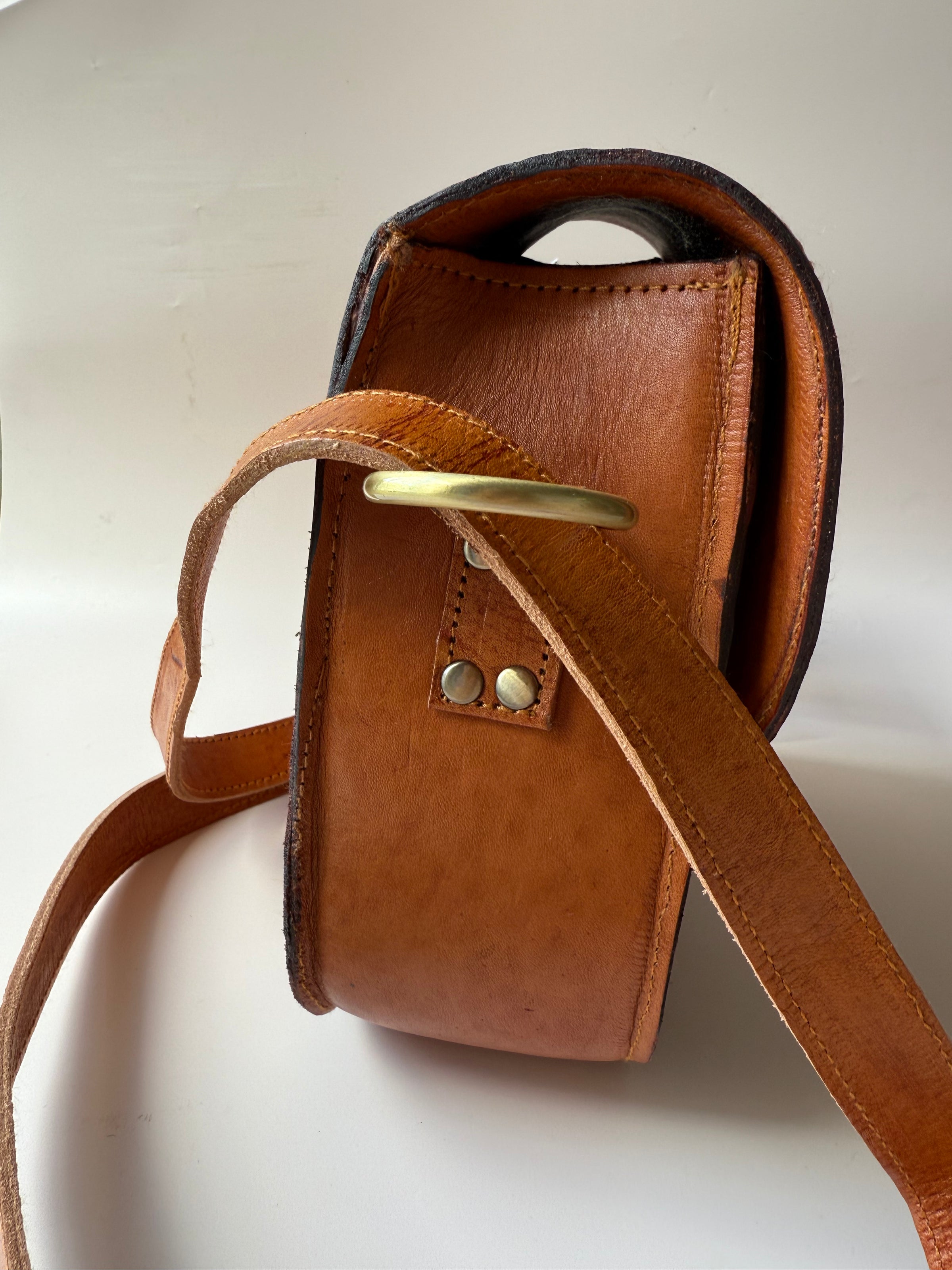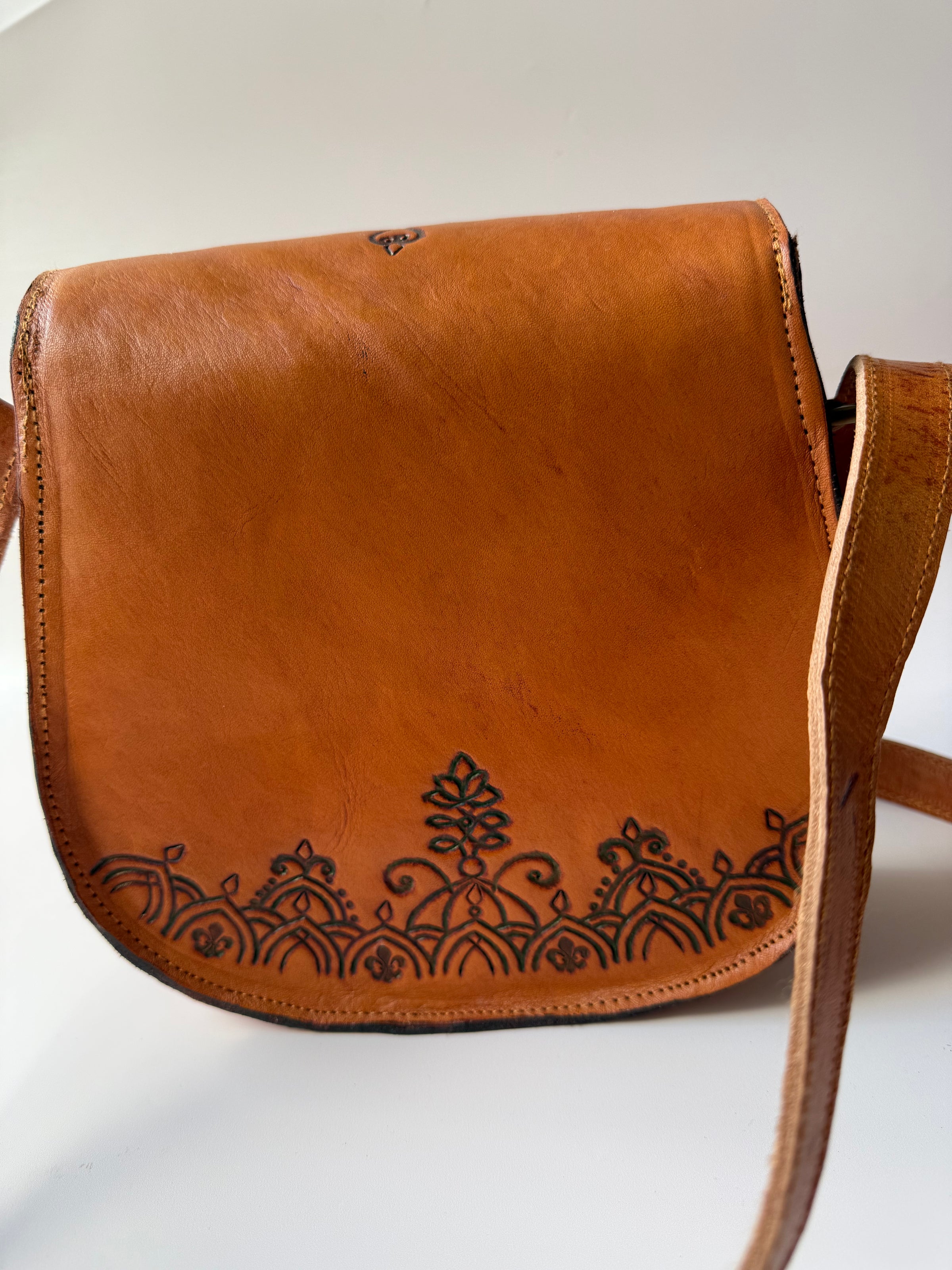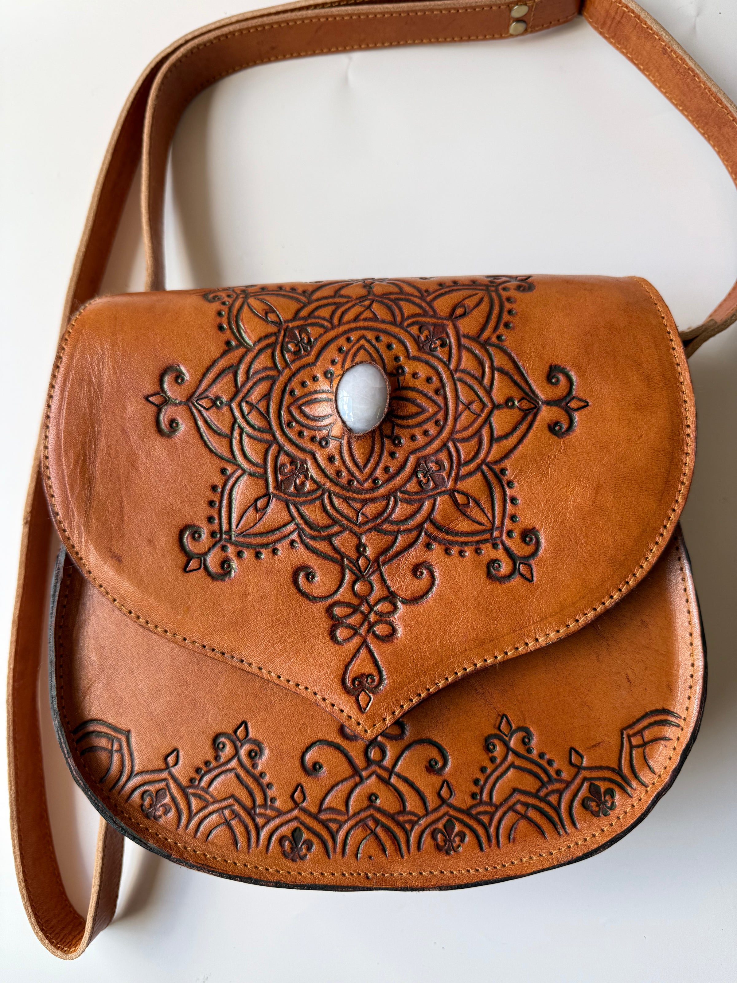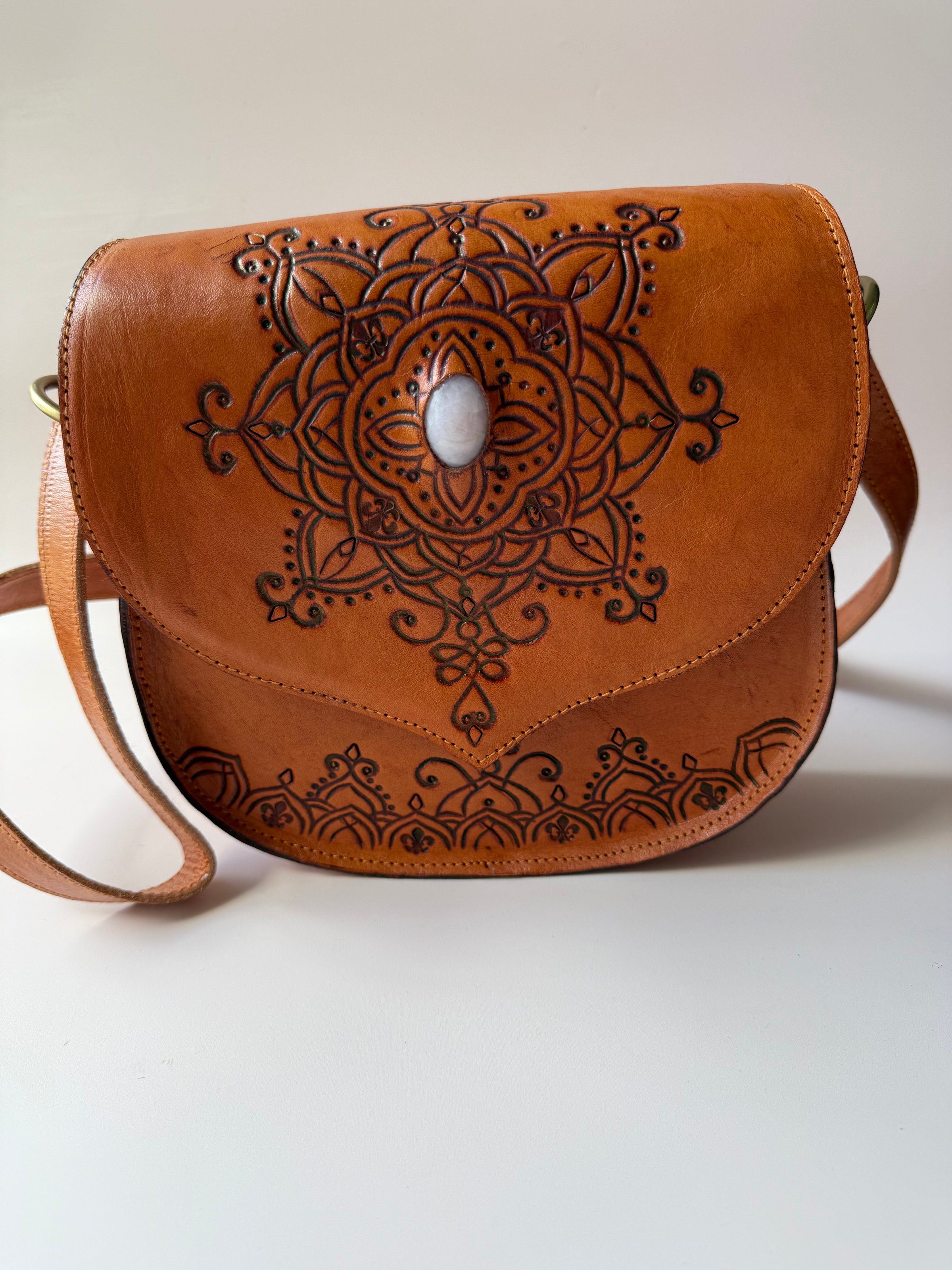 Introducing Klancie Slingbag, the perfect blend of style and craftsmanship. Hand-tooled leather creates a stunning crossbody satchel, complete with a beautiful whitish pink stone accent. Elevate any outfit with this stunning handbag.