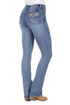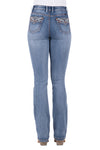 34” leg - boot cut, stretch for comfort and movement, high rise, logo shank button, metal rivets, woven logo label on back yoke, feature embroidery on back pockets, front scoop pockets and coin pocket, PW embroidery on coin pocket, contrast all over topstitch.