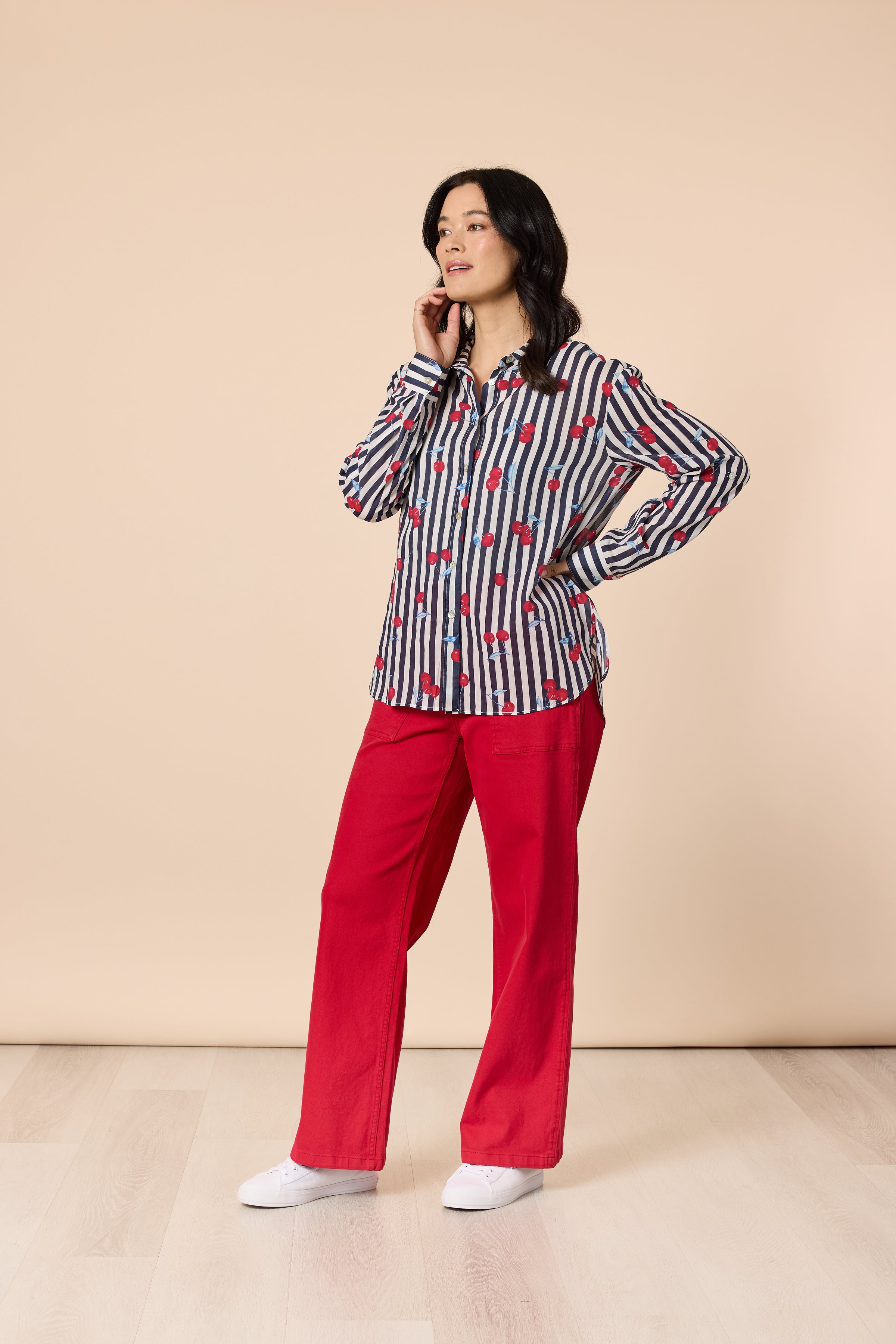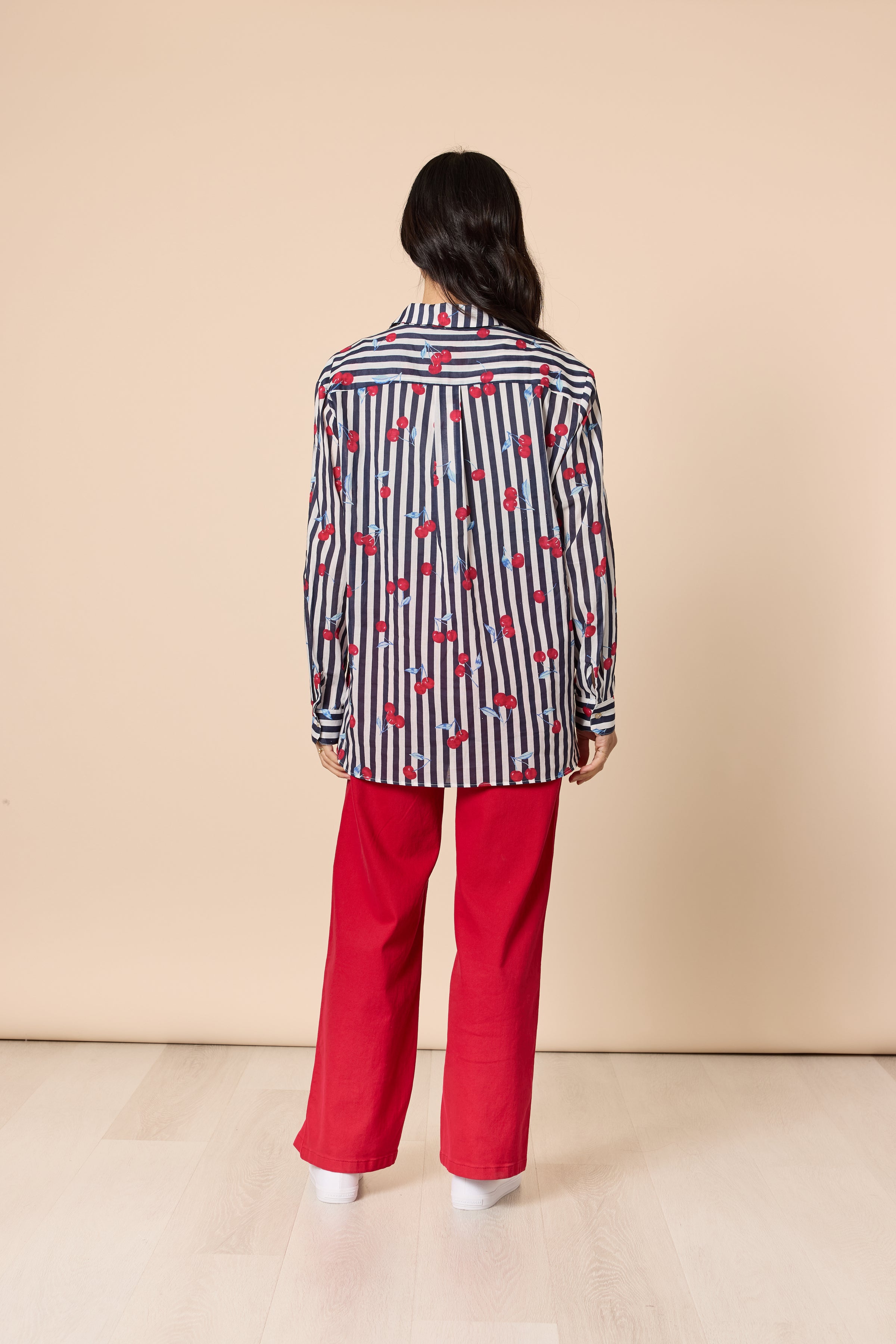 Brighten your wardrobe with the Cherry Stripe Sheer Shirt.