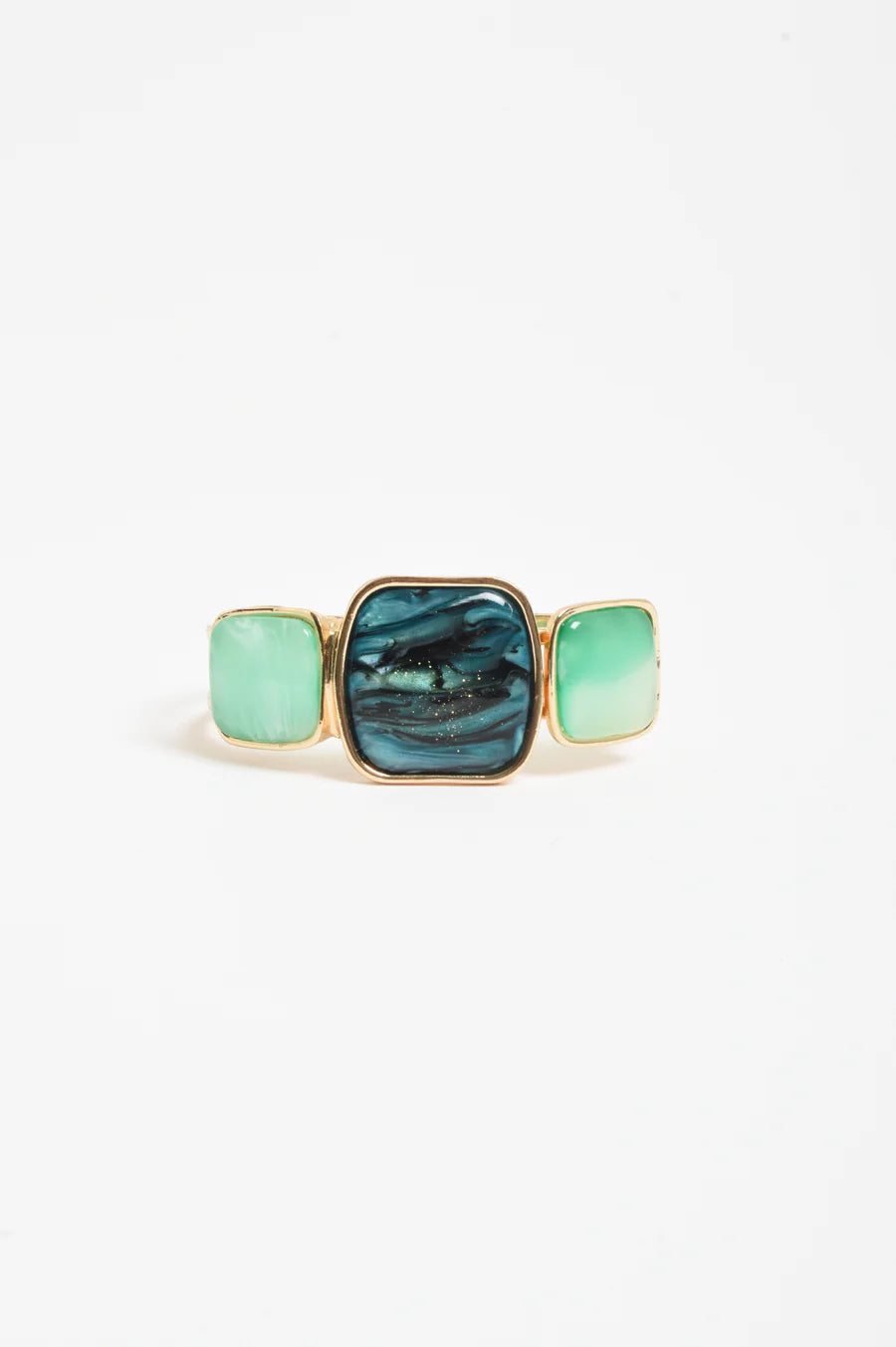 The Metal Resin Hinge Back Bangle in Teal Green features resin panels framed with gold hardware.