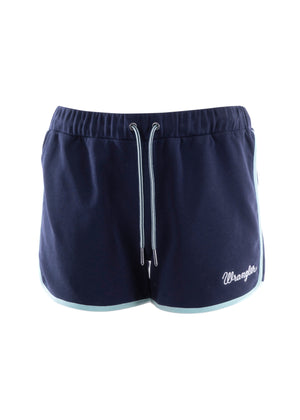 Lightweight french terry track short, contrast binding with flattering side panel detail, contrast twisted drawcord with Wrangler iconic metal trims, Wrangler iconic logo embroidery on front leg hem, Wrangler iconic logo pip label on waistband seam.