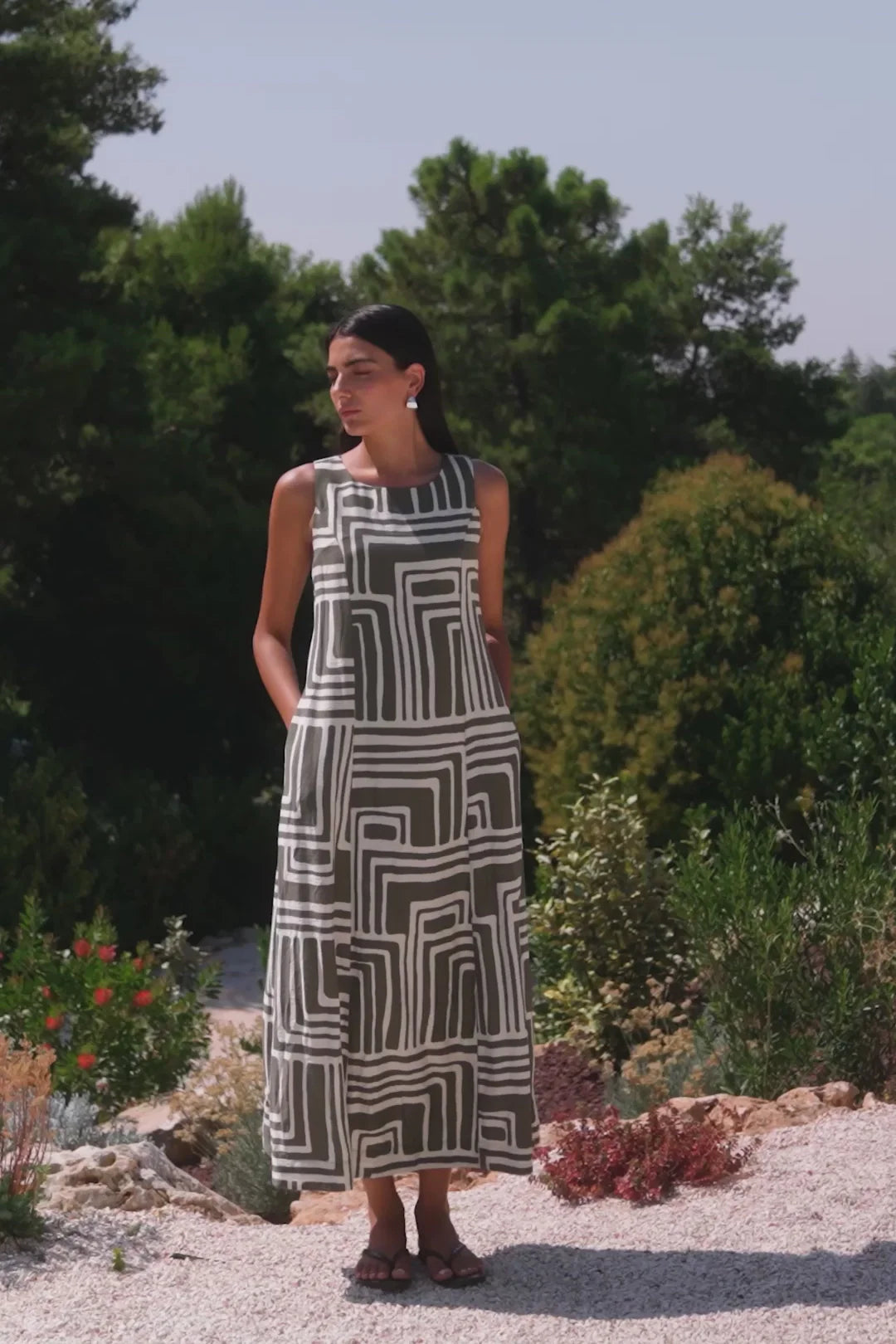 The Future khaki maze print dress is a striking mix of simplicity and bold design. With its clean crew neckline and sleeveless cut, the silhouette is timeless, while the geometric print gives it a modern, statement edge. Made from a soft viscose-nylon blend, it drapes beautifully and feels light against the skin.