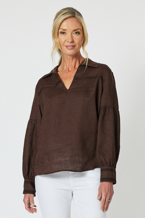 Elize linen shirt by Gordon Smith in a rich chocolate colour styles perfectly over white or cream