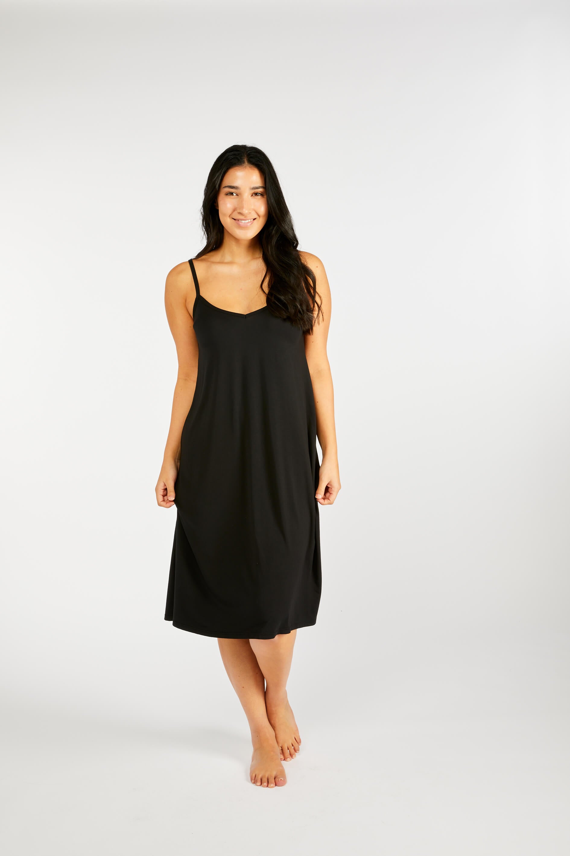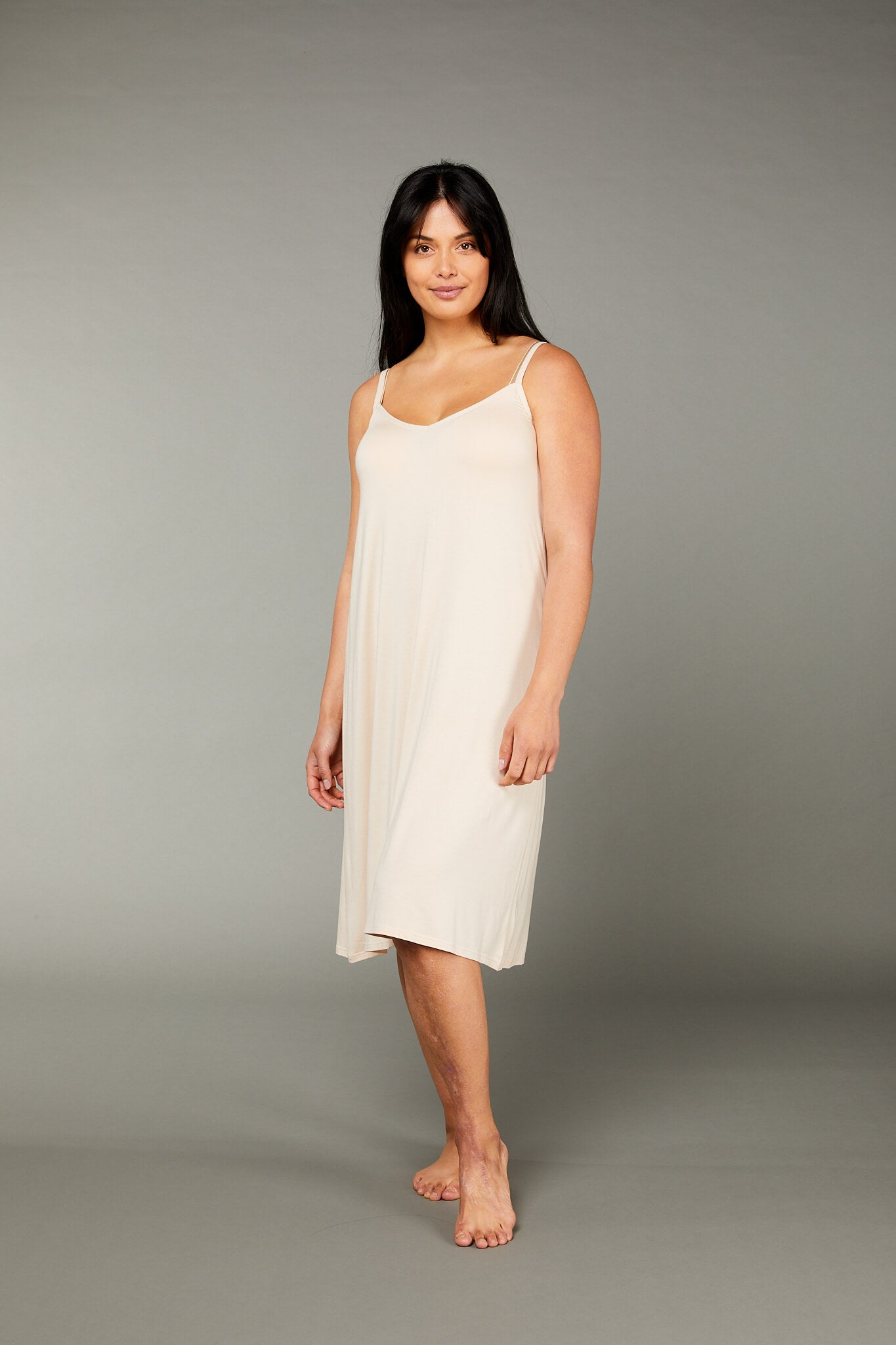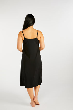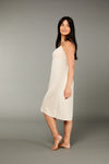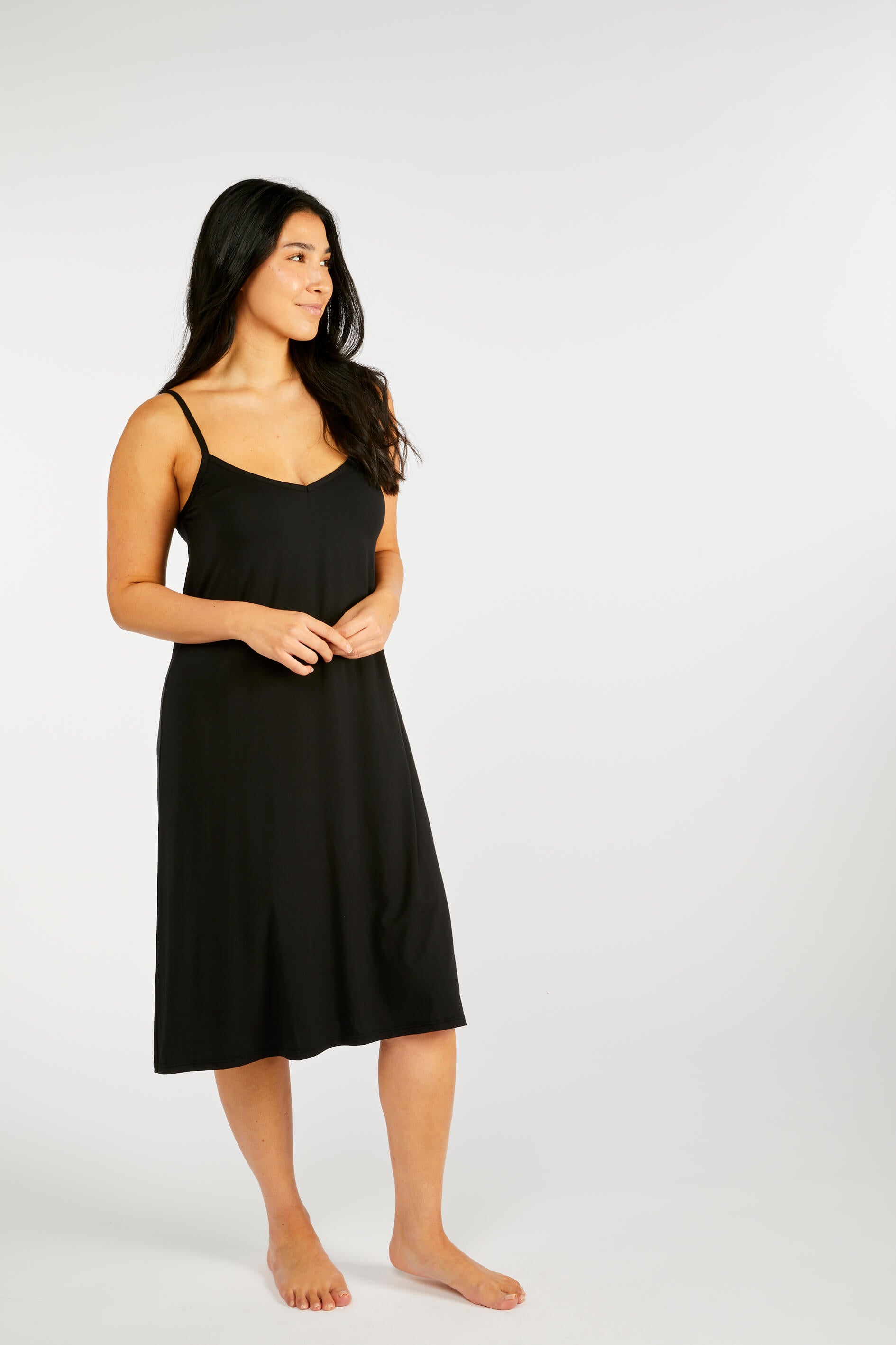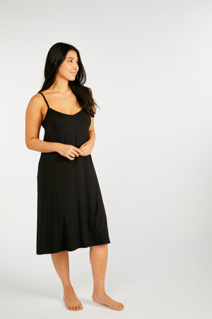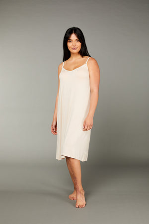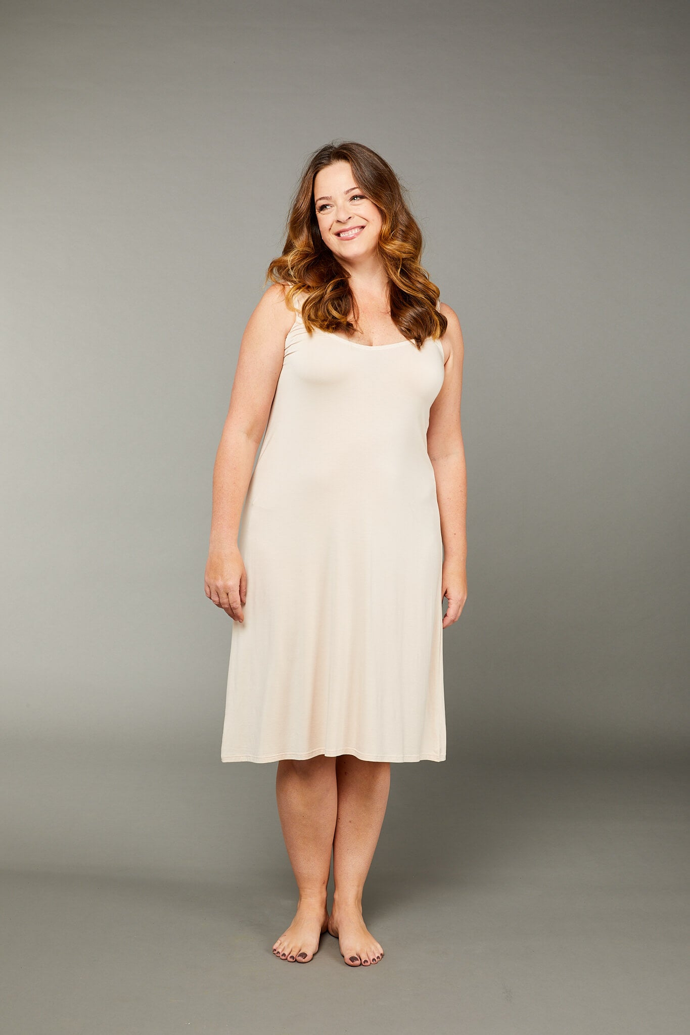 This new long slip is fuller, less body hugging than our staple short slip. The Amy slip has wider, adjustable shoestring straps, v-neckline and falls below the knee. Perfect for layering under sheer dresses or just putting on for a day at home to keep cool.