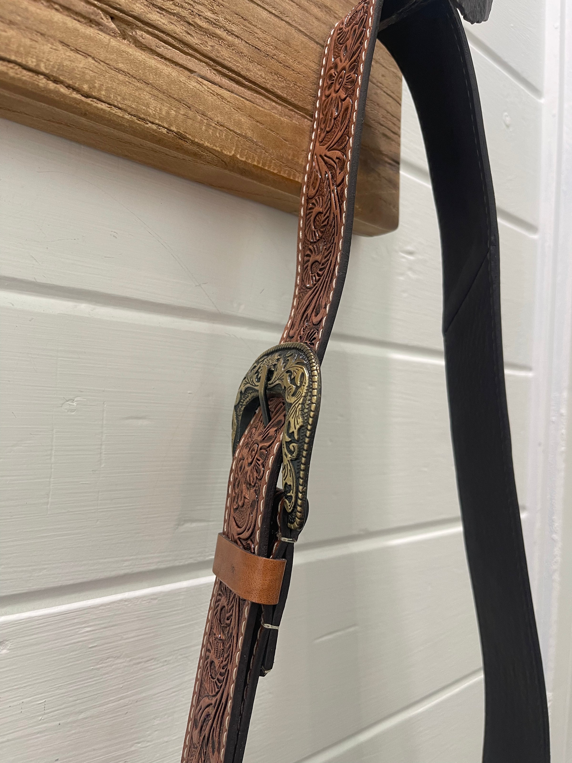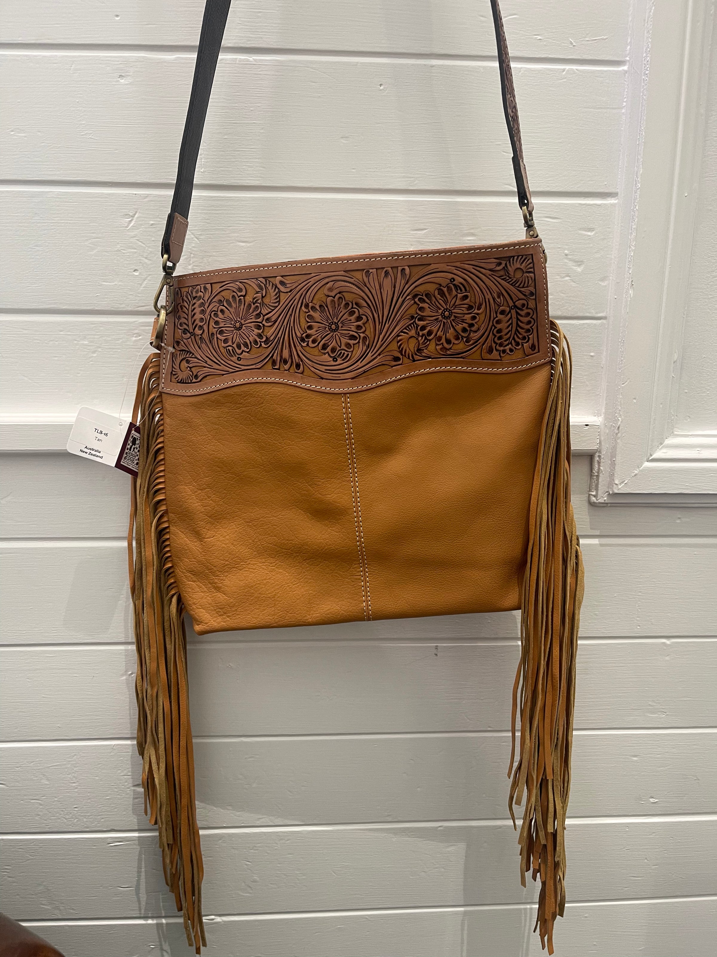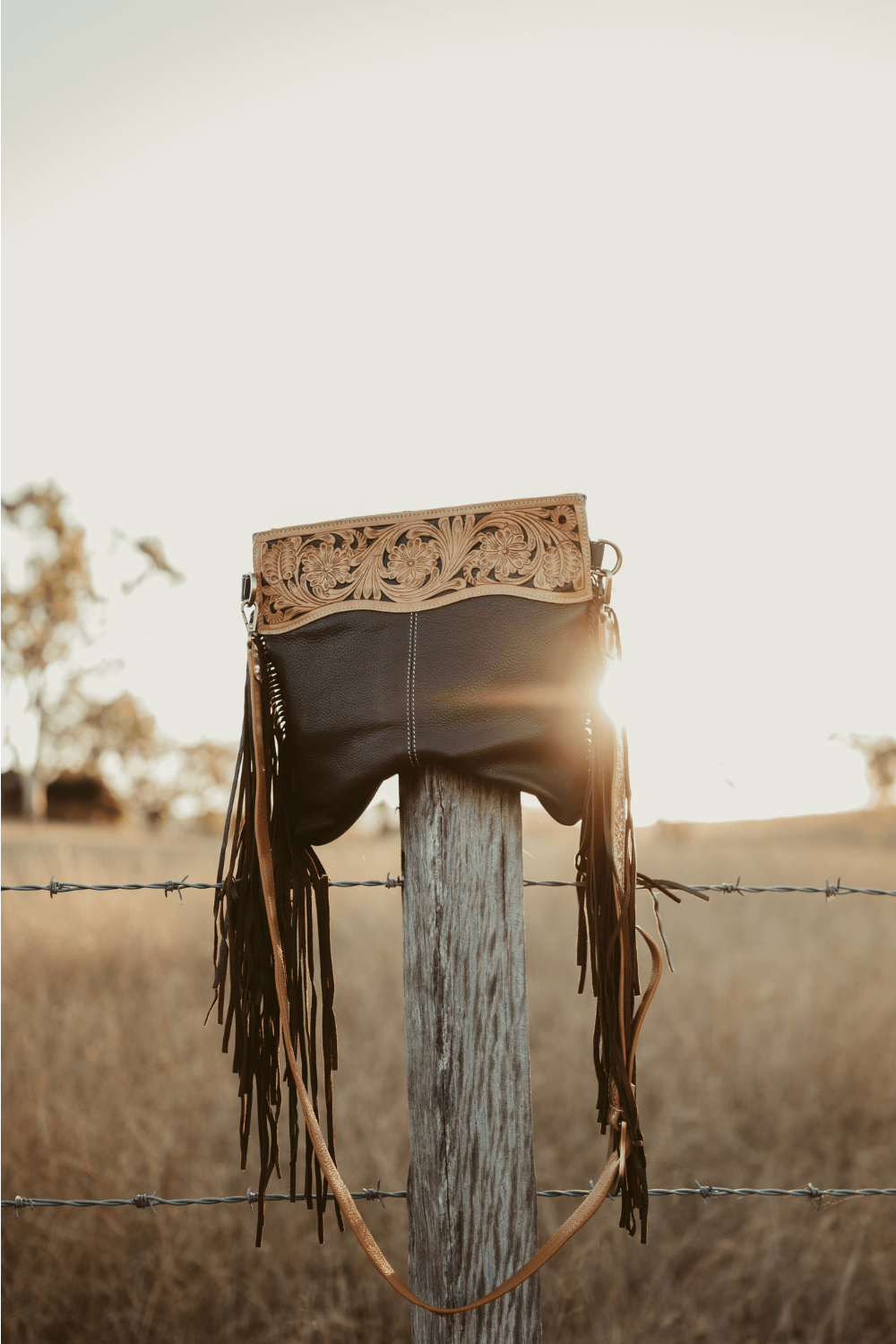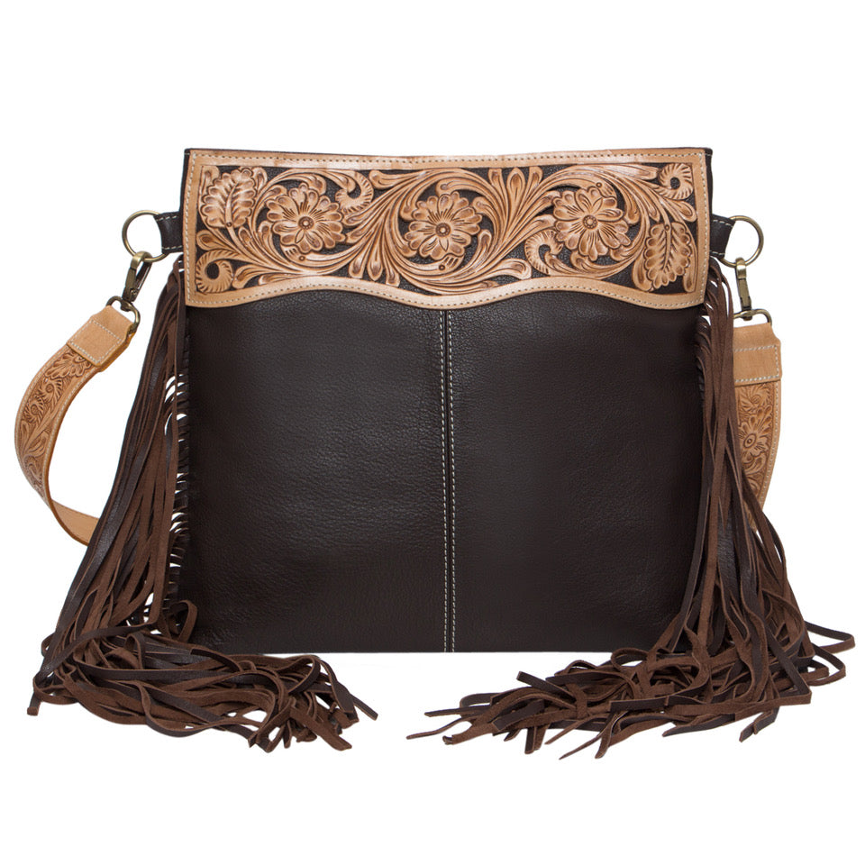 This exquisite medium sling bag with intricate hand carving details and contrasting tan tooling adds a touch of grace and distinction to your everyday life. Hand Carving details on the front panel and a long strap with hand tooling details, along with leather fringes on the sides makes this number your perfect comrade.