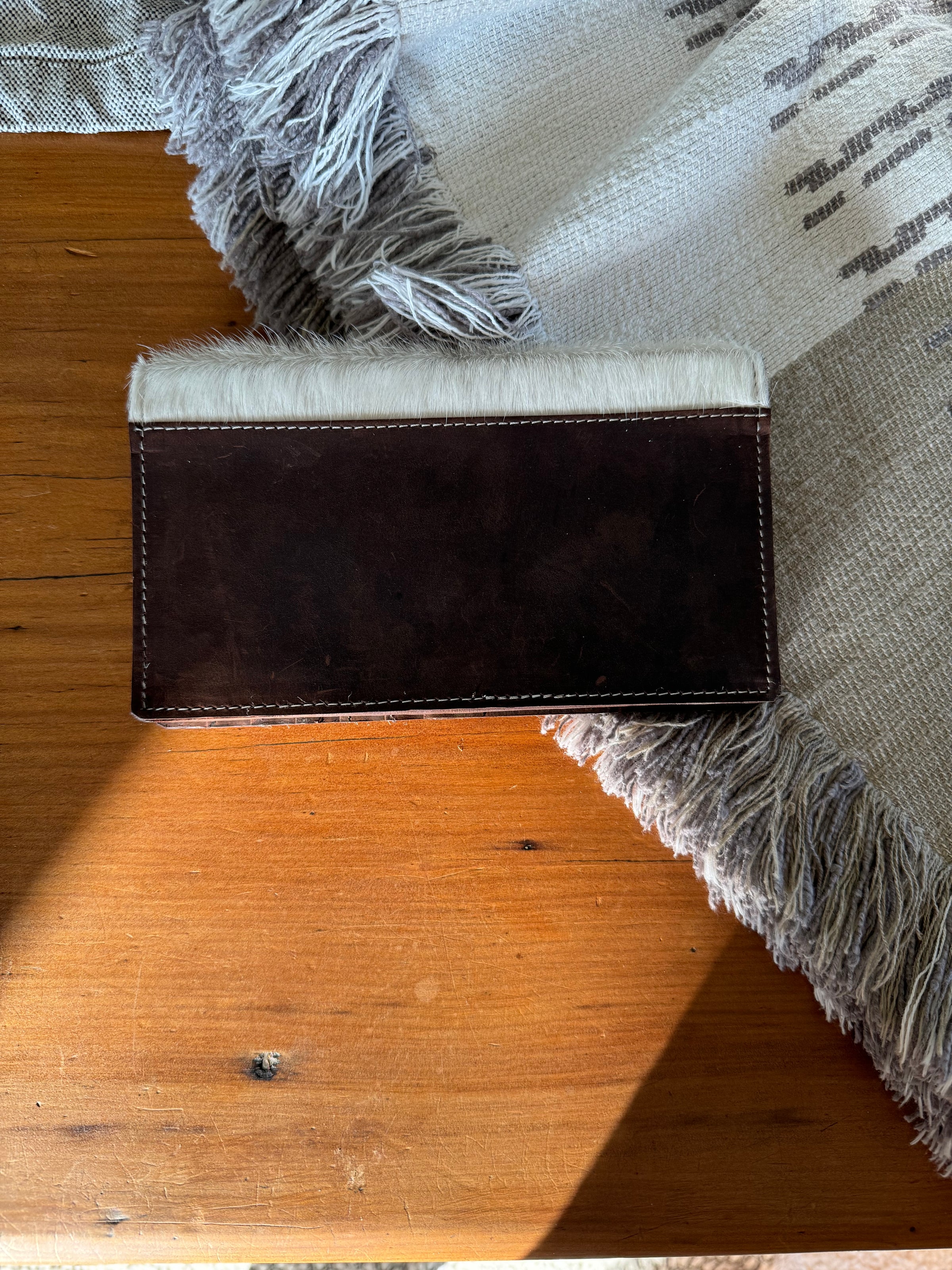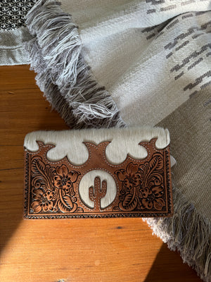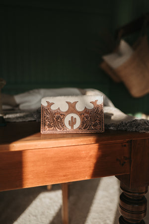 "Spice up your wallet game with our Cactus Cowhide Wallet! Made with high-quality leather featuring a unique, tooled cactus print, this wallet has 11 card slots, 1 photo ID spot, a zipper compartment, and 3 note compartments. Keep your cards and cash organized in style!"