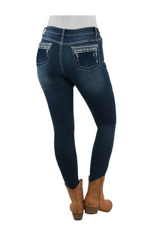 Features: New fit 29 Inch leg super skinny, stretch for comfort, high rise, logo shank button and metal rivets, woven logo badge on back yoke, PW embroidery on coin pocket, feature embroidery on back pockets and front scoop pockets, contrast all over topstitch