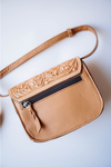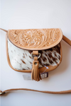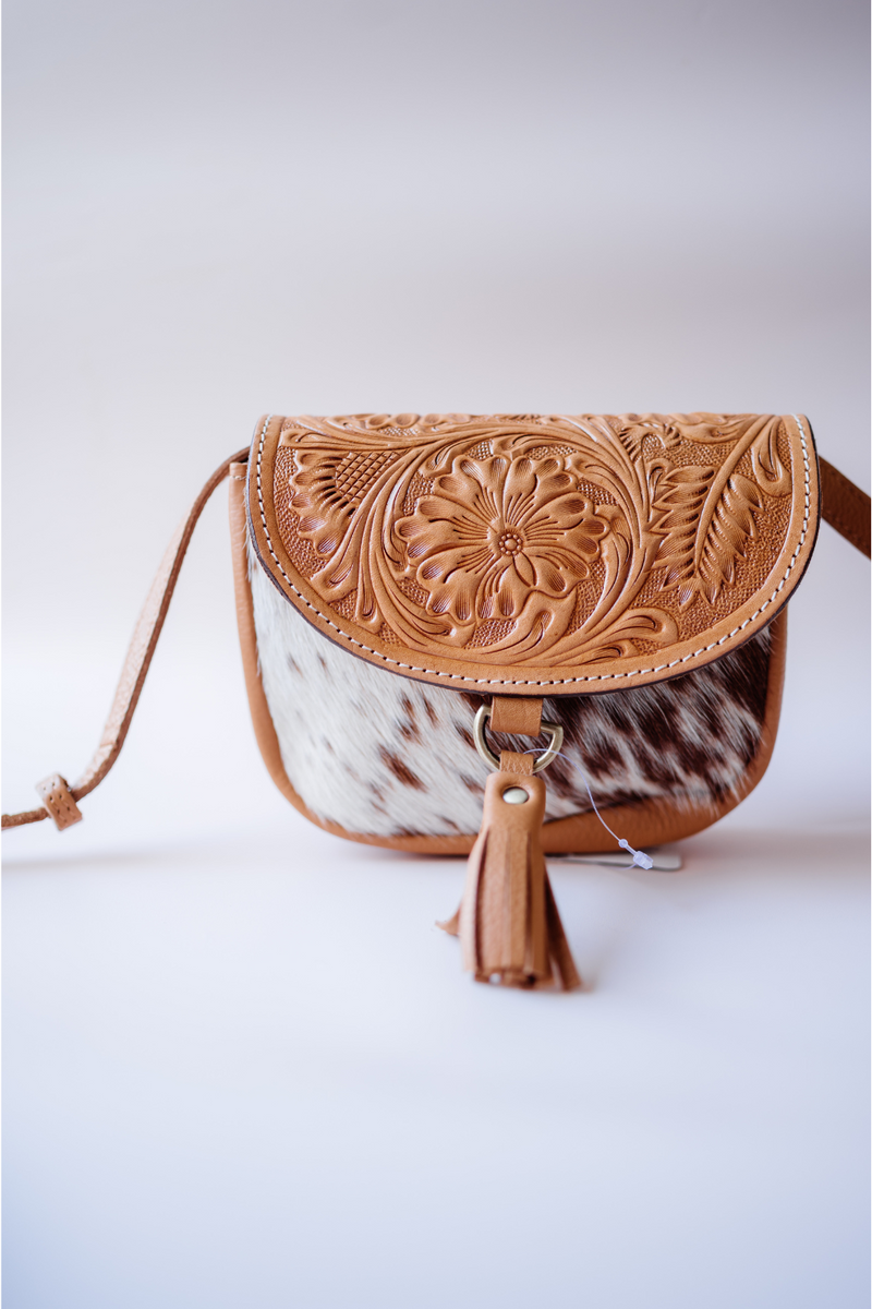Carry your essentials in style with the Haiti Cross Body Bag. Featuring a tan and white cowhide body with a beautifully tooled flap, this small sling bag adds a touch of rustic charm to any outfit. The adjustable strap ensures a perfect fit, making it your go-to for weekends out or lively concerts. Compact yet eye-catching, it’s designed for those who like to travel light but stand out.
