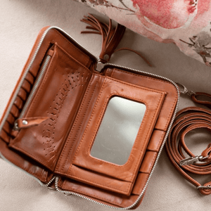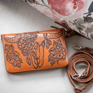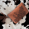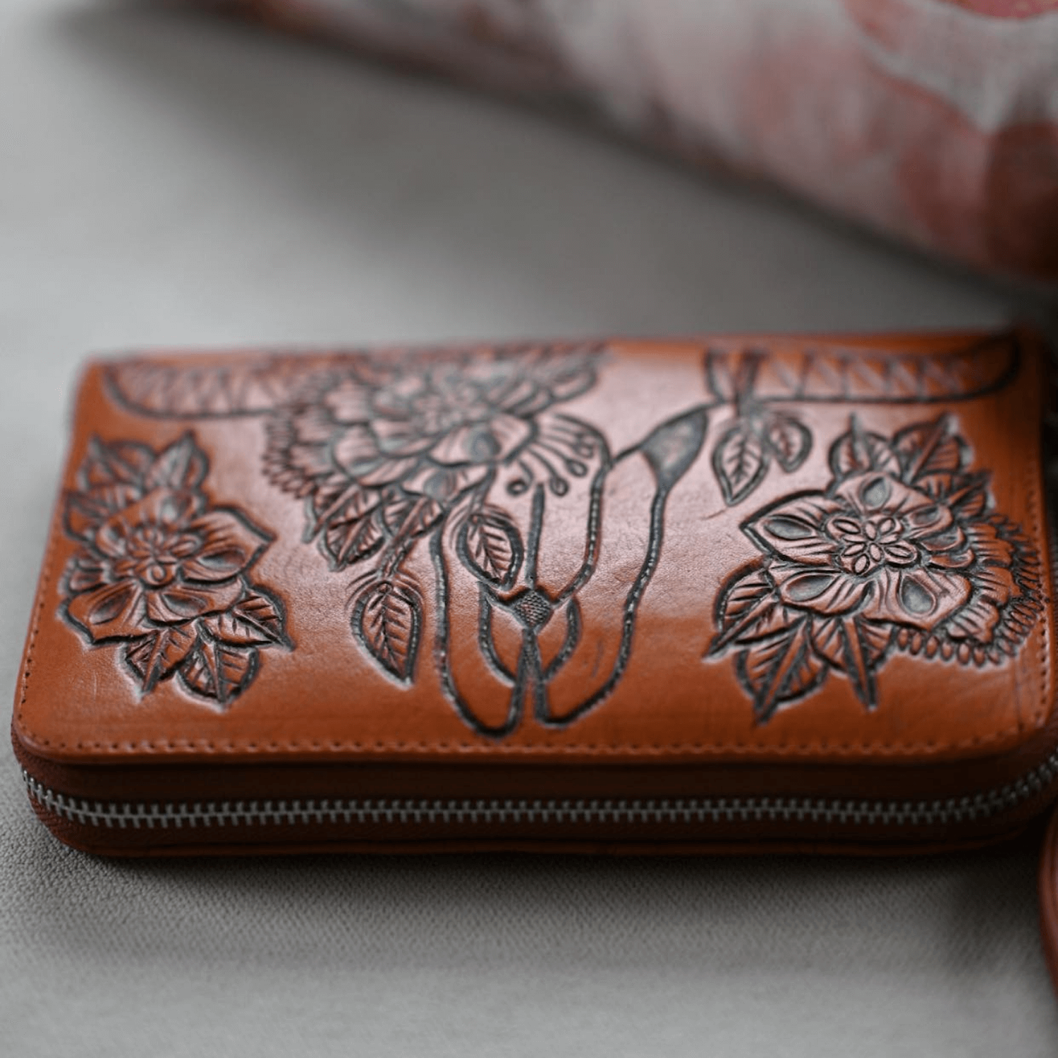 Beautiful hand tooled leather zip round wallet with all the right compartments and is finished off with bohemian inspired details.