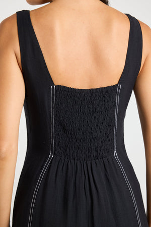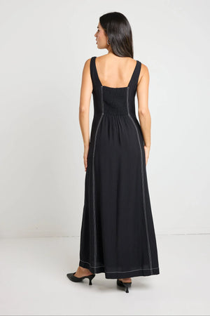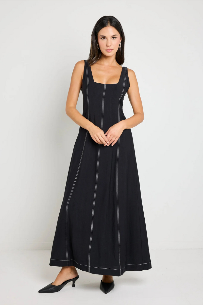Embrace minimalist sophistication with the Index black dress. Its sleek square neckline and contrast stitching details create a modern, tailored silhouette. Perfect for both casual and dressy occasions, this maxi dress effortlessly combines understated elegance with contemporary style.