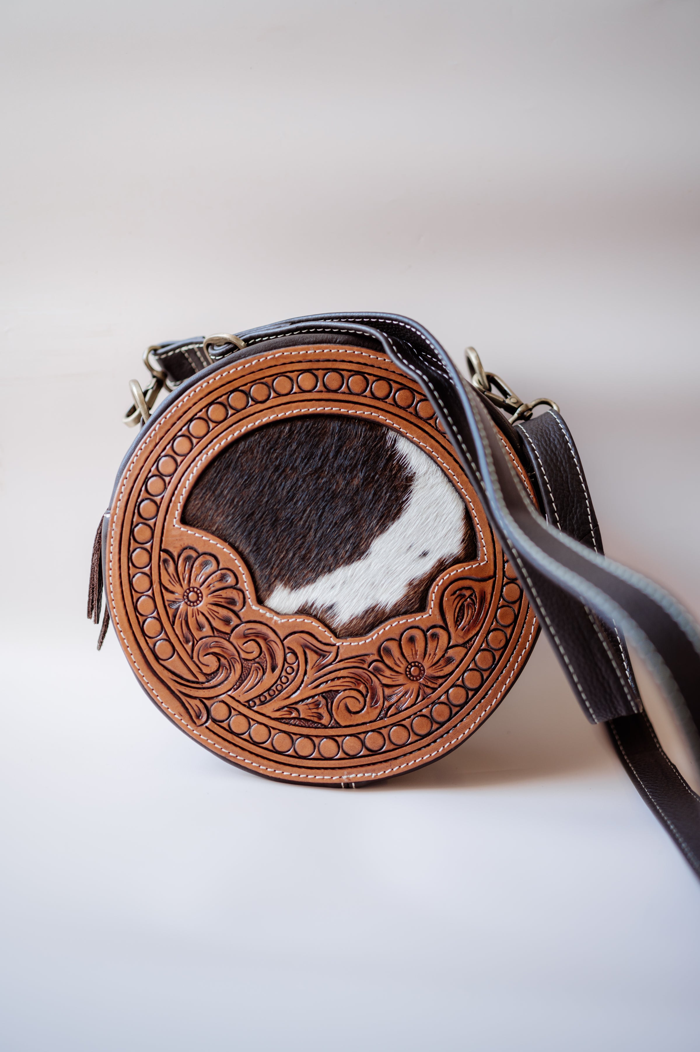This gorgeous circular ensemble with intricate hand tooled details on the front panel adds touch of sovereignty and freedom to your everyday life. The long detachable sling strap makes this beauty a comfortable adornment which is surely a show stopper.