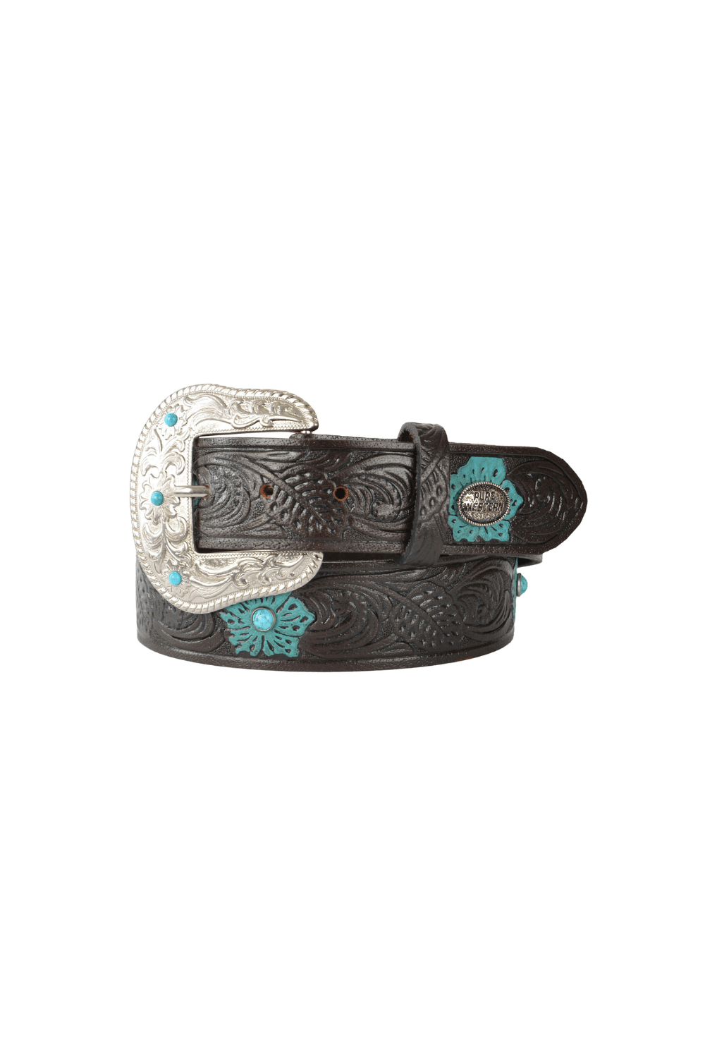 Genuine leather tooled strap, handpainted flowers, turquoise studs, antique silver hardware.