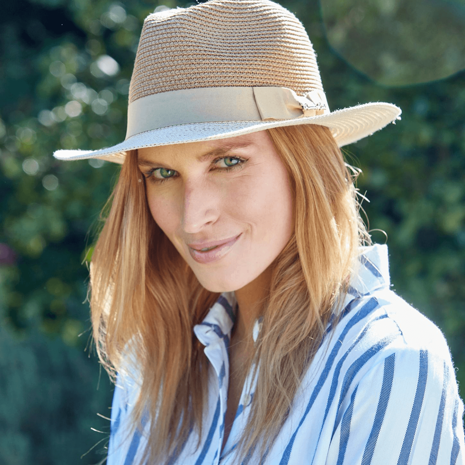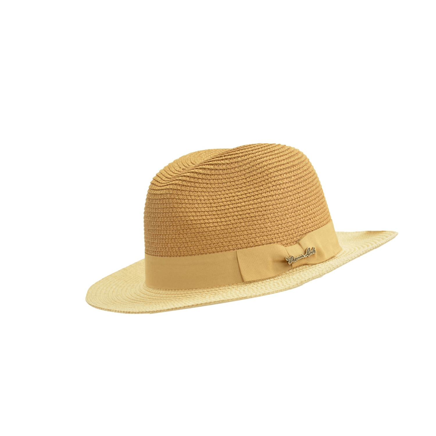 Features: Pleated sand hat band, sand crown with stone brim, ribbon feature trim with bow, grosgrain sweat band, Thomas Cook metal logo pin