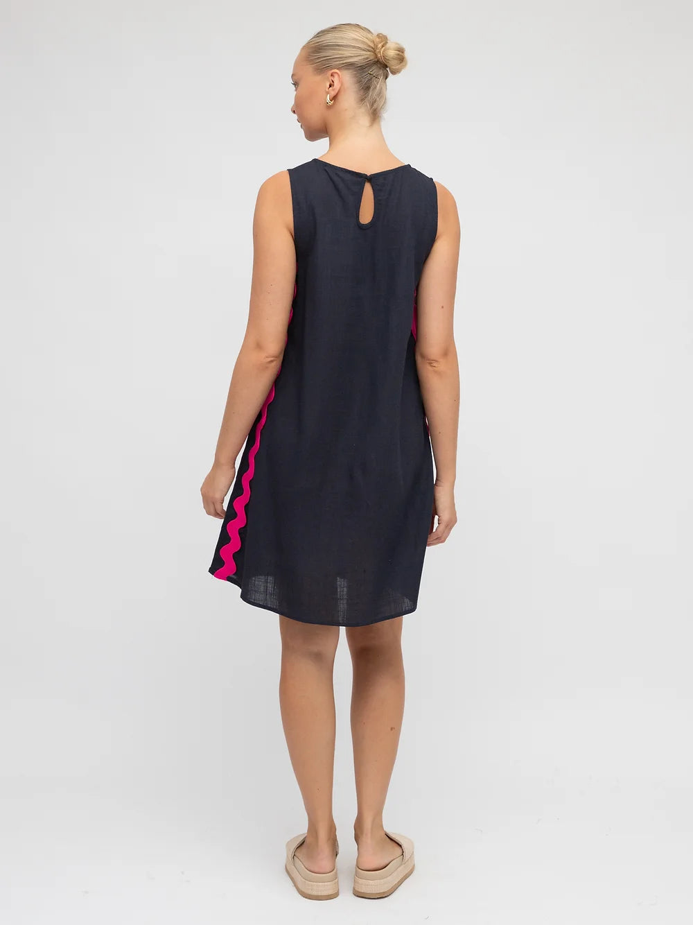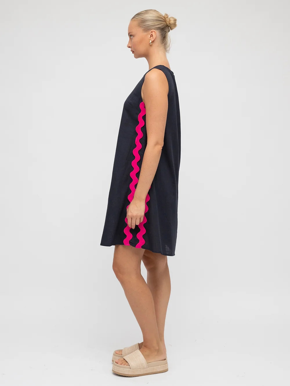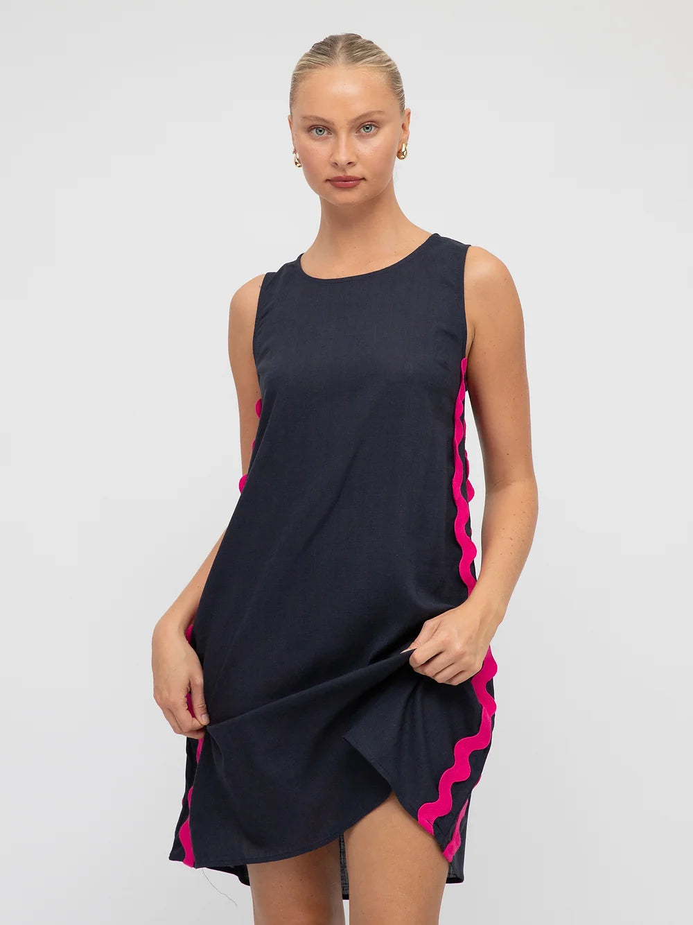 Get ready to turn heads with the Lola Navy Dress! Made with a soft and lightweight rayon linen, this knee-length dress features a playful pink ric rac detail and a classic rounded neckline. Perfect for any occasion, it's a versatile and stylish addition to your wardrobe.