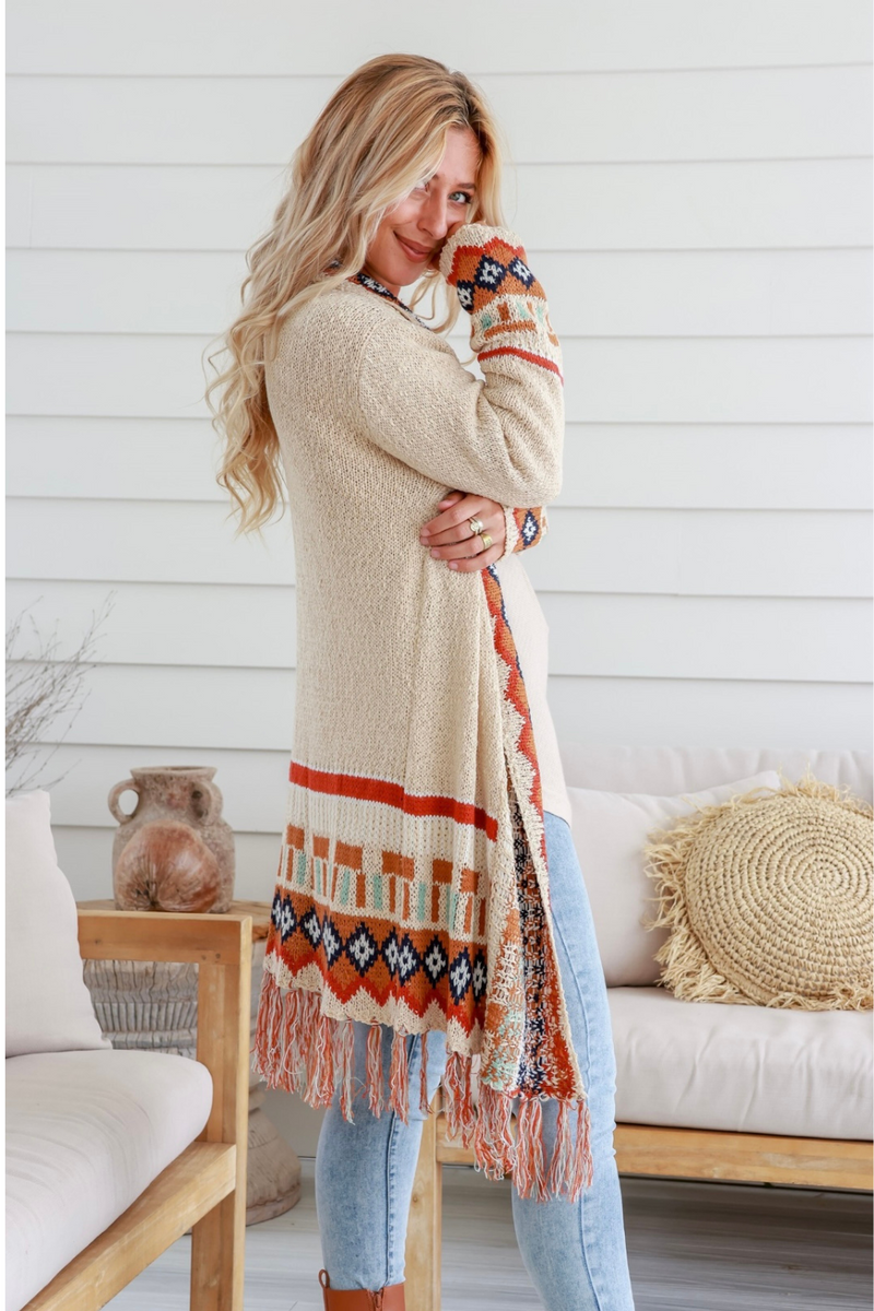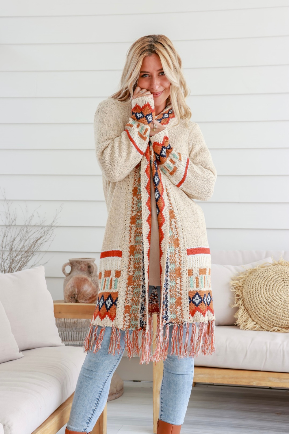 Looking to elevate your winter wardrobe? Look no further than this long cardi in natural cream. With earthy tones on the sleeves and hem, this cardi adds a touch of warmth and style to any outfit. (Go ahead, get cozy and stylish at the same time!)