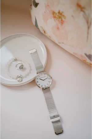 Leave your mark and be true to yourself and your dreams. Features of this timepiece include a 45mm Silver case, carefully styled with a quality 20mm silver mesh band, Silver hands and Austrian Crystal Indexes. The romantic design of the crisp white 42mm dial, silver case and the exquisite Austrian crystals make you look good while you build your Empire.
