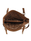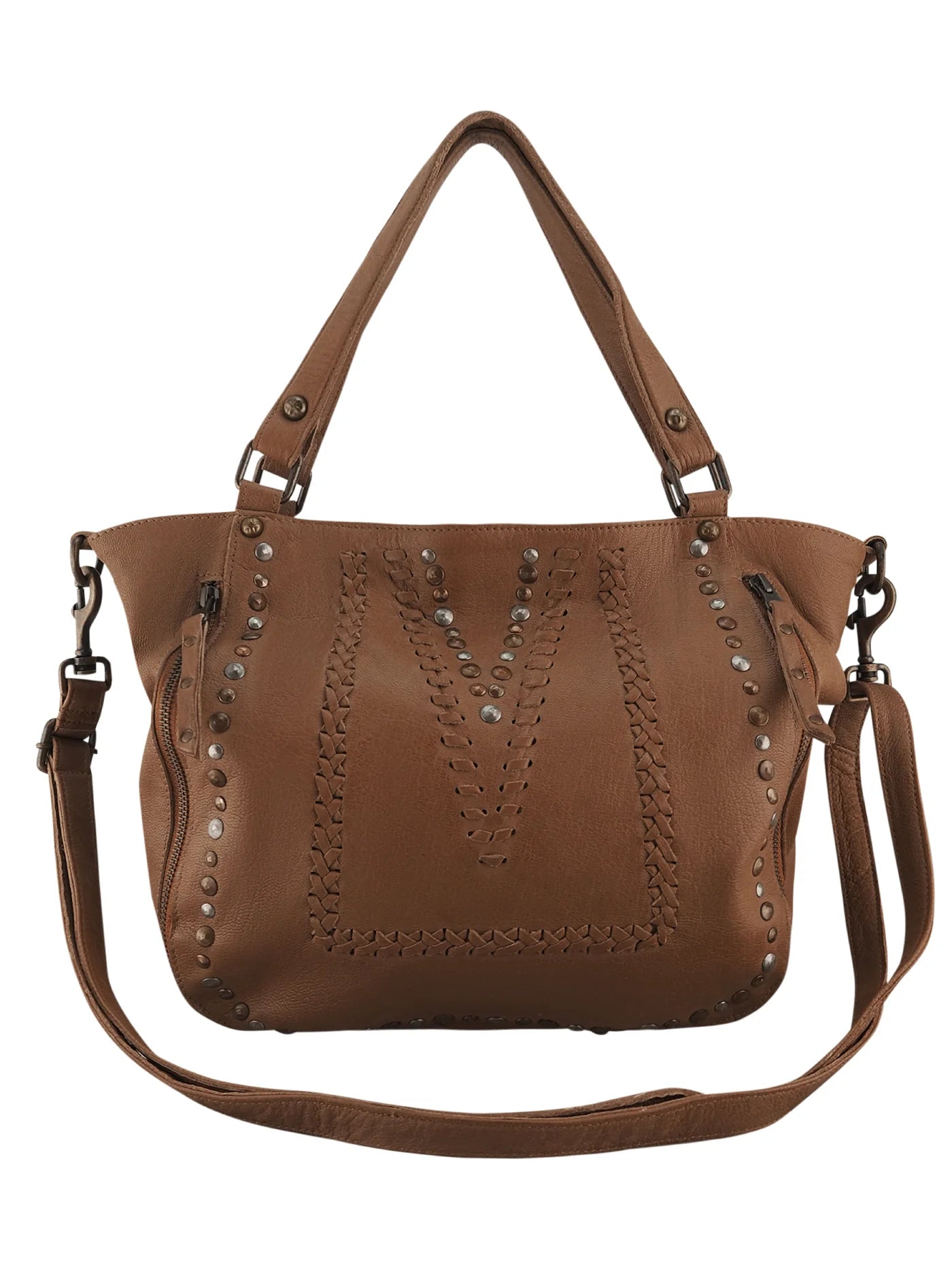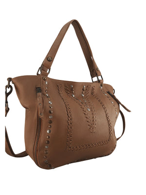 - Hand stitching and studs in various antique brass shades form a stunning design on the front panel