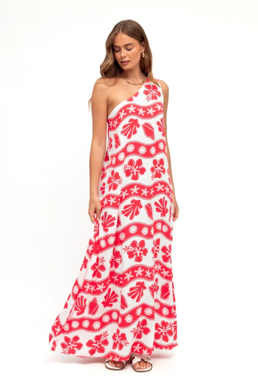 Take the Kaida Dress to your next beach party! This off the shoulder maxi dress is made from rayon, making it lightweight and flowy. The vibrant shell red print adds a pop of colour to your look.