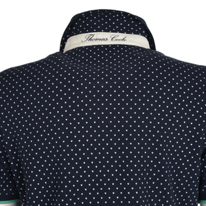Features: Birdseye geometric print, silver collar stand button, drill collar, mint trim, rib cuffs, stretch for comfort