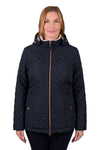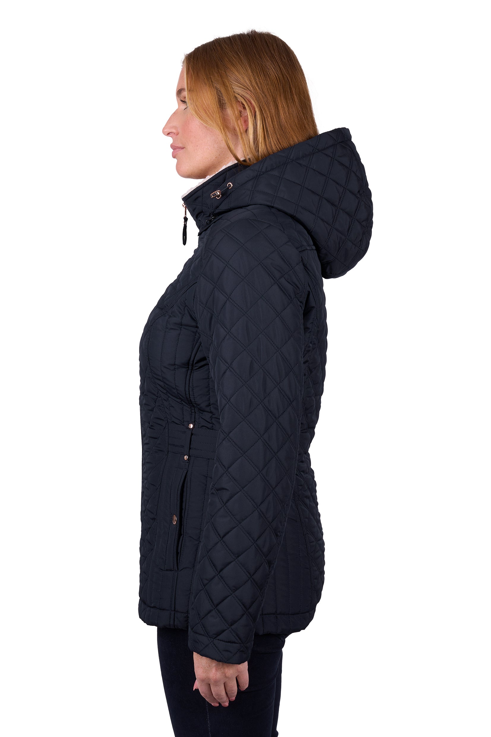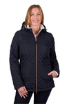 Lightweight diamond quilted body and sleeves, quilted waist shaping to flatter the figure, mock waist tab, rust proof metal accessories, premium quality zip closures, detachable hood, sherpa body and hood lining, front side pockets with snap closure.
