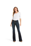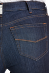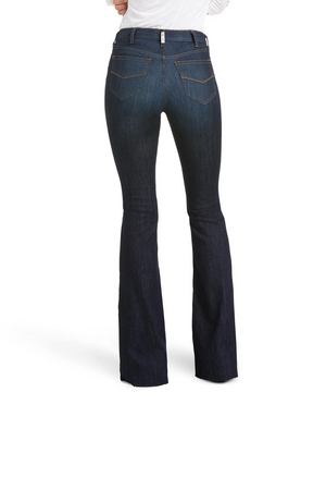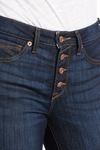 The minimalist pockets, dark wash and raw-edge hem allow the rose-gold button fly to really shine in our Ophelia Flare Jean. Show it off with a front tuck or crop top.