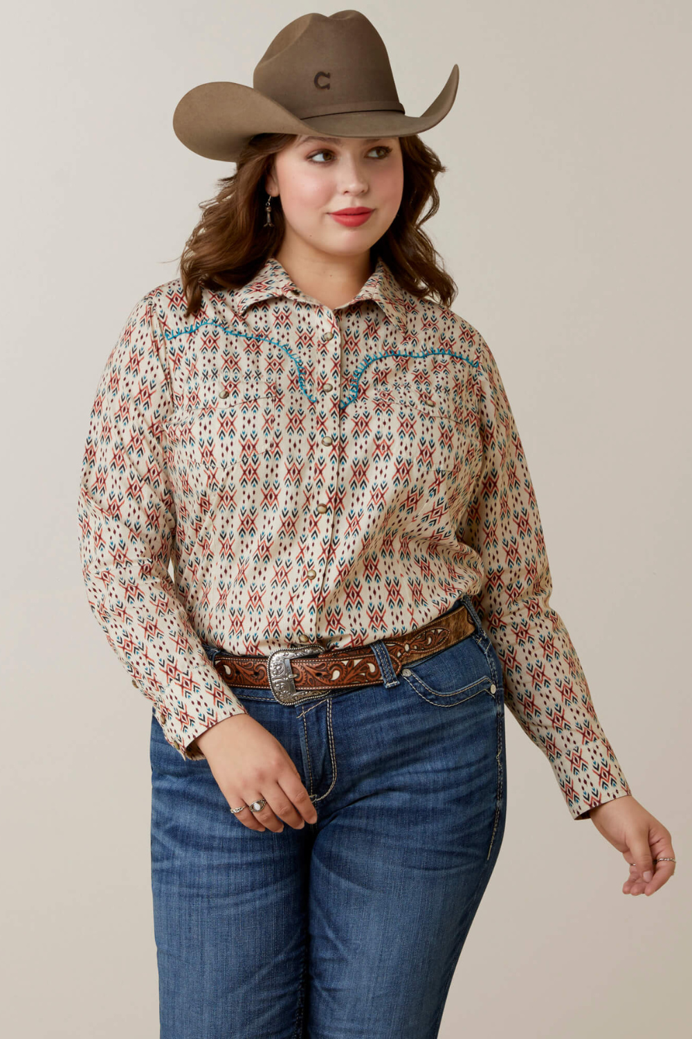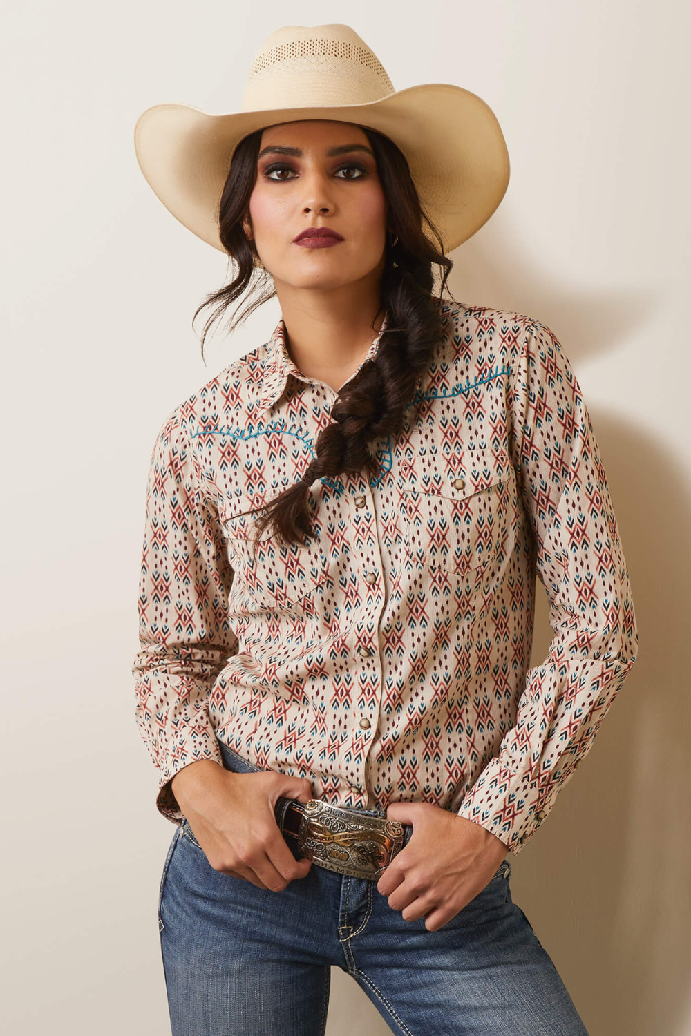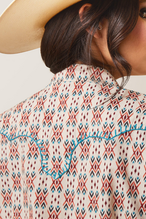Ride in it, live in it, layer up in it, this rider fave is perfect for work or play. Premium details, like bone pearl buttons, blanket stitching, and the southwest print make a statement in and out of the saddle.