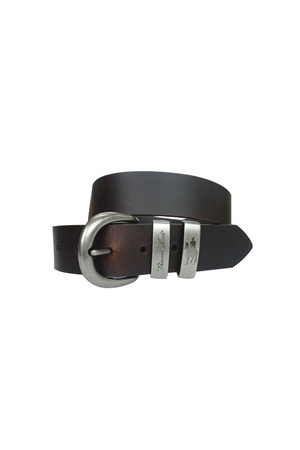 Metal buckle and embossed logo twin keepers, 38mm (1 1/2 Inch) strap width. Genuine Leather.