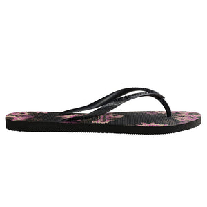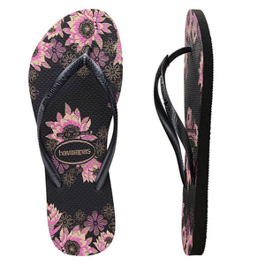 Havaianas Slim Organic Black/Dark Grey/Rose Gold Thongs. Floral prints are in full bloom this season! This style features classic black Havaianas soles with a pink and cream floral print on the soles and matching black slim straps. These thongs are a must-have in any summer wardrobe.