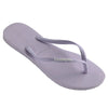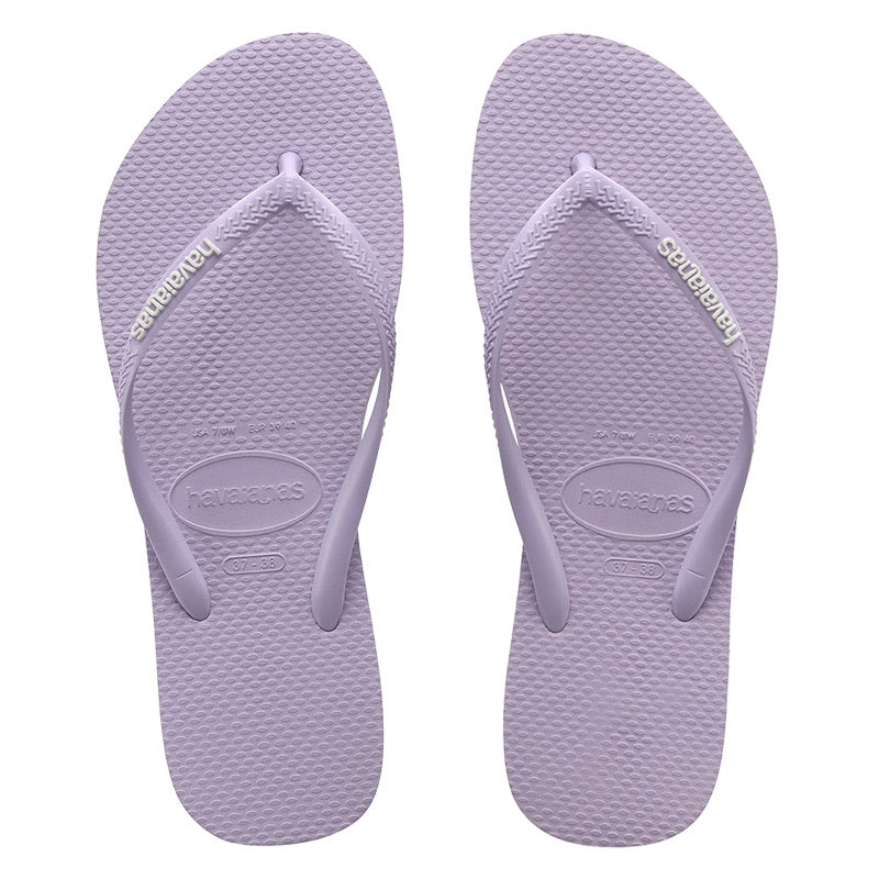 Havaianas Slim Rubber Logo Lilac Calm Thongs. This is our take on pastel perfection and everyone needs a touch of pastel in their summer wardrobe! This style features classic lilac slim Havaianas soles with matching lilac slim Havaianas straps and a contrast white rubber logo to complete the pair.