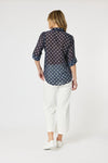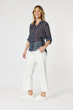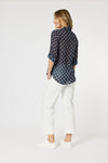 Introducing the Sorrento Shirt by threads: a playful polka dot navy and white design that will add a touch of whimsy to your wardrobe. Its longer hemline and tab sleeve detail make it the perfect mix of stylish and comfortable. So go ahead, have some fun with your style!