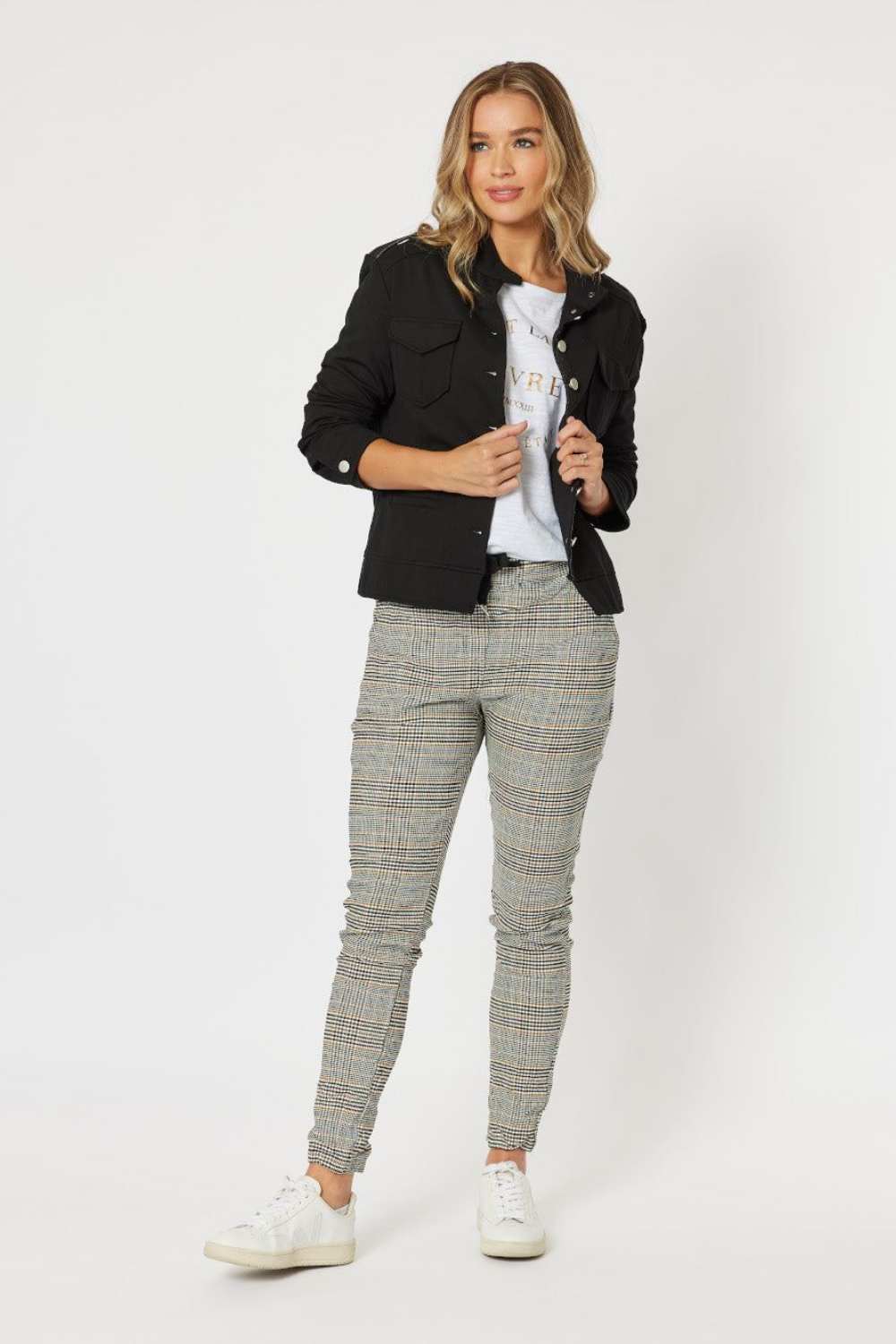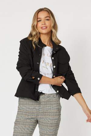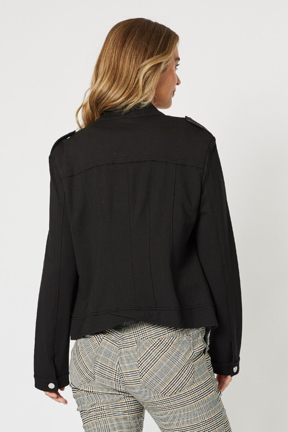 Add some serious style to your wardrobe with the Threadz Ponte Military Jacket! This soft, stretchy jacket gives you the perfect layered look without sacrificing comfort. Whether you're dressing it up or down, this black jacket is always a great choice.