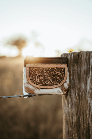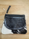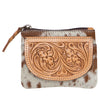 This delightfully created card and change cowhide purse which is practical and fashionable. This cowhide purse keeps your bag light by holding a few cards and coins. With intricate tooling details on the flap along with a zipper pocket and an open card pocket, its ideal  for a grocery run or a casual night out.