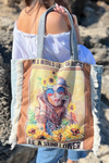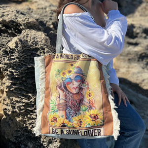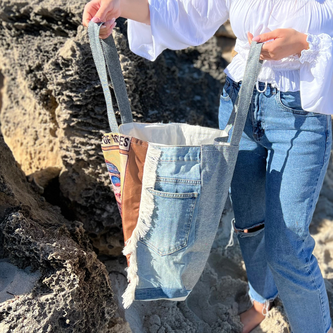 Large tote styled bag with graphic print. This unique style is quirky and will also fit everything you need for the beach, work or stay overnight. With colourful ribbon tassel, fringing & the cute jeans pockets on the sides.