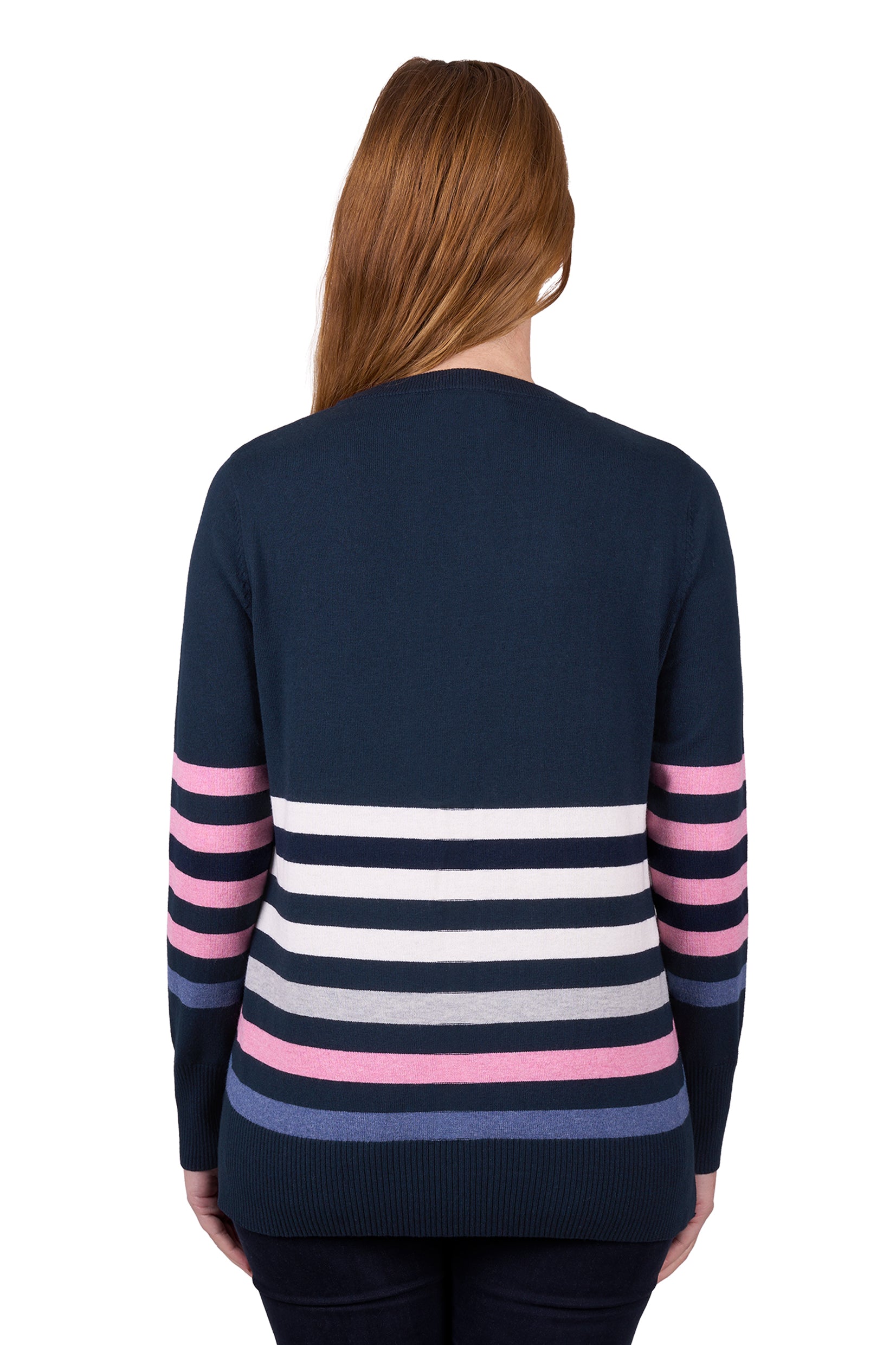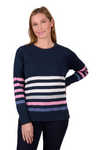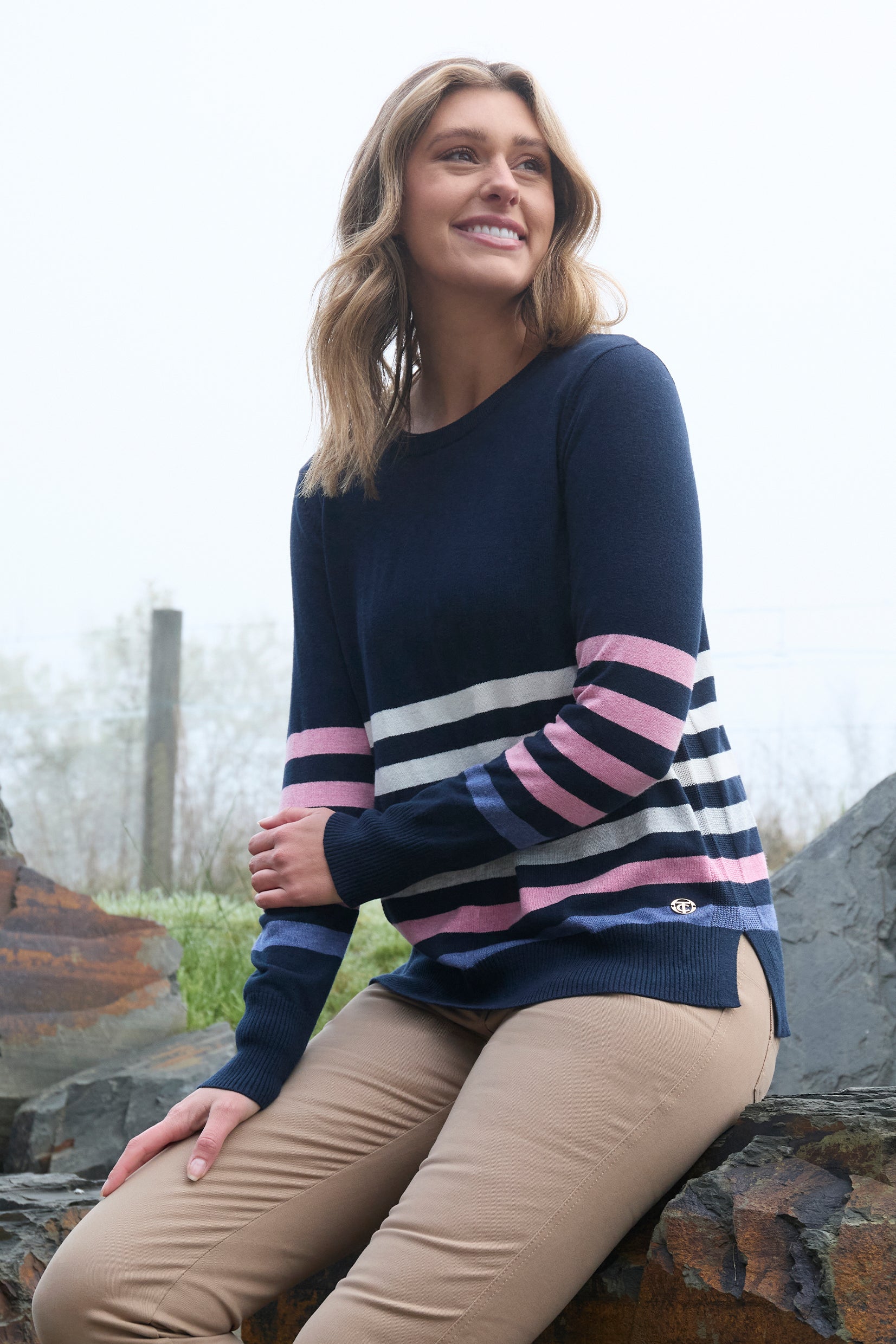 Lightweight fully fashioned stripe knit, Australian merino wool blend, contrast inside neck, rib neck, cuffs and hem to keep shape, side seam splits, TC metal logo on side hem.