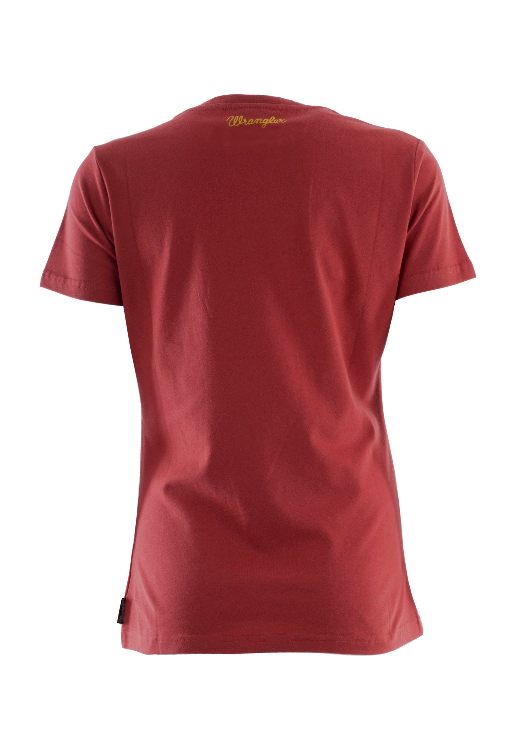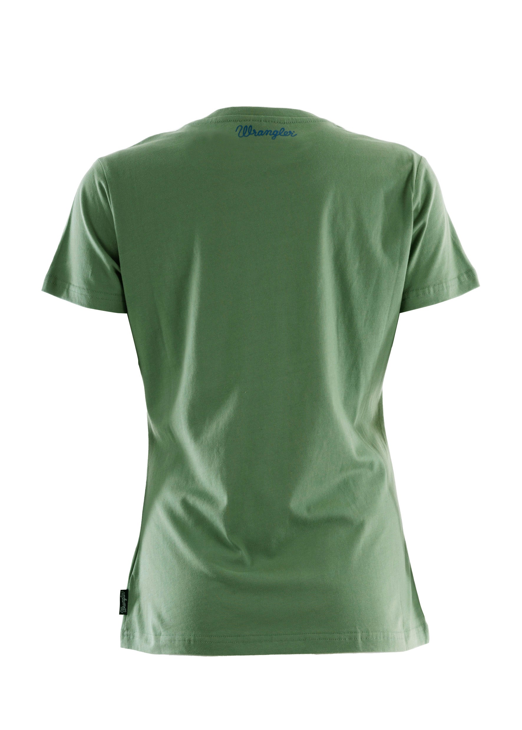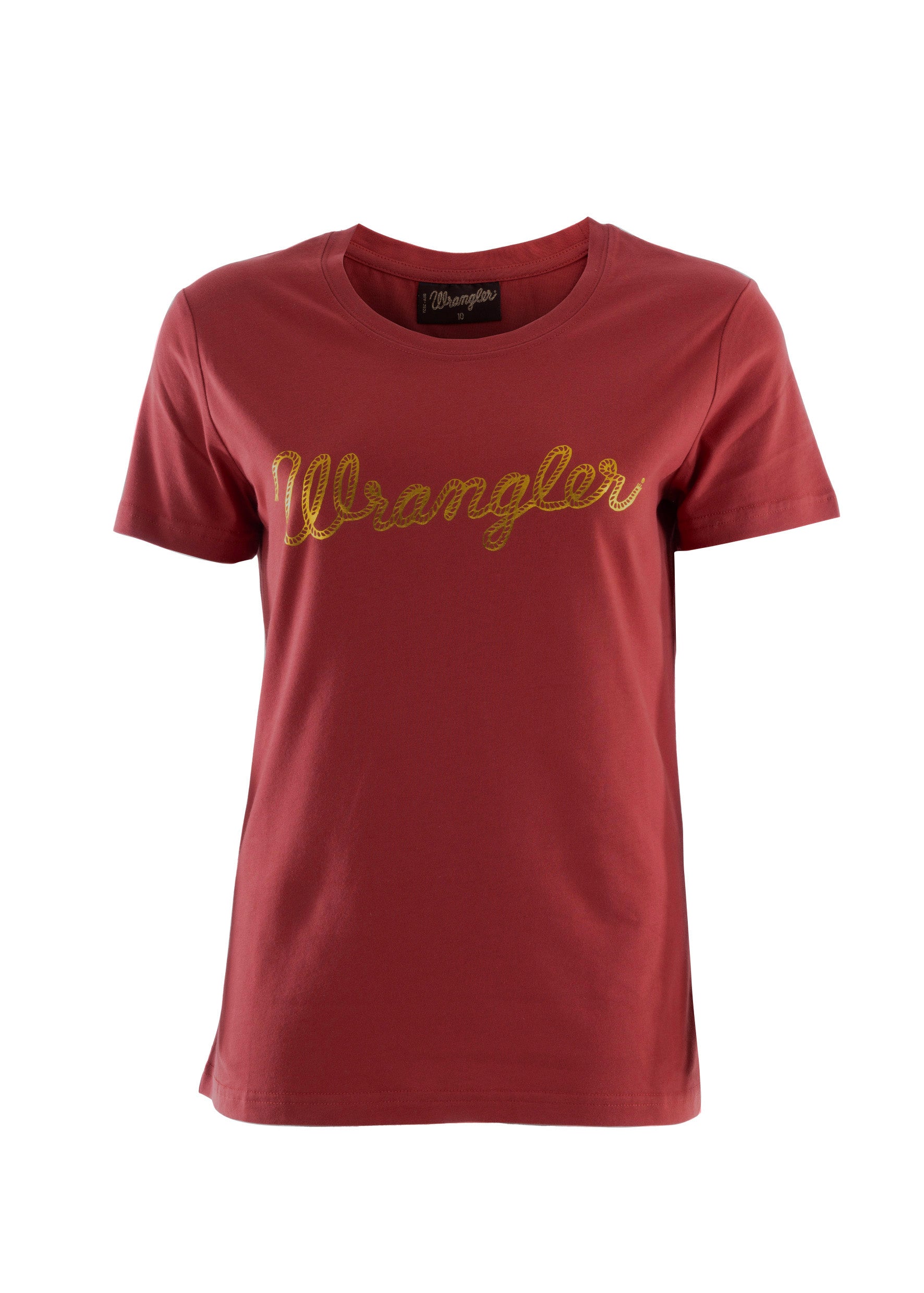 Large front feature Wrangler iconic logo metallic print, Wrangler iconic logo back neck metallic print, Wrangler iconic logo pip label on side seam.