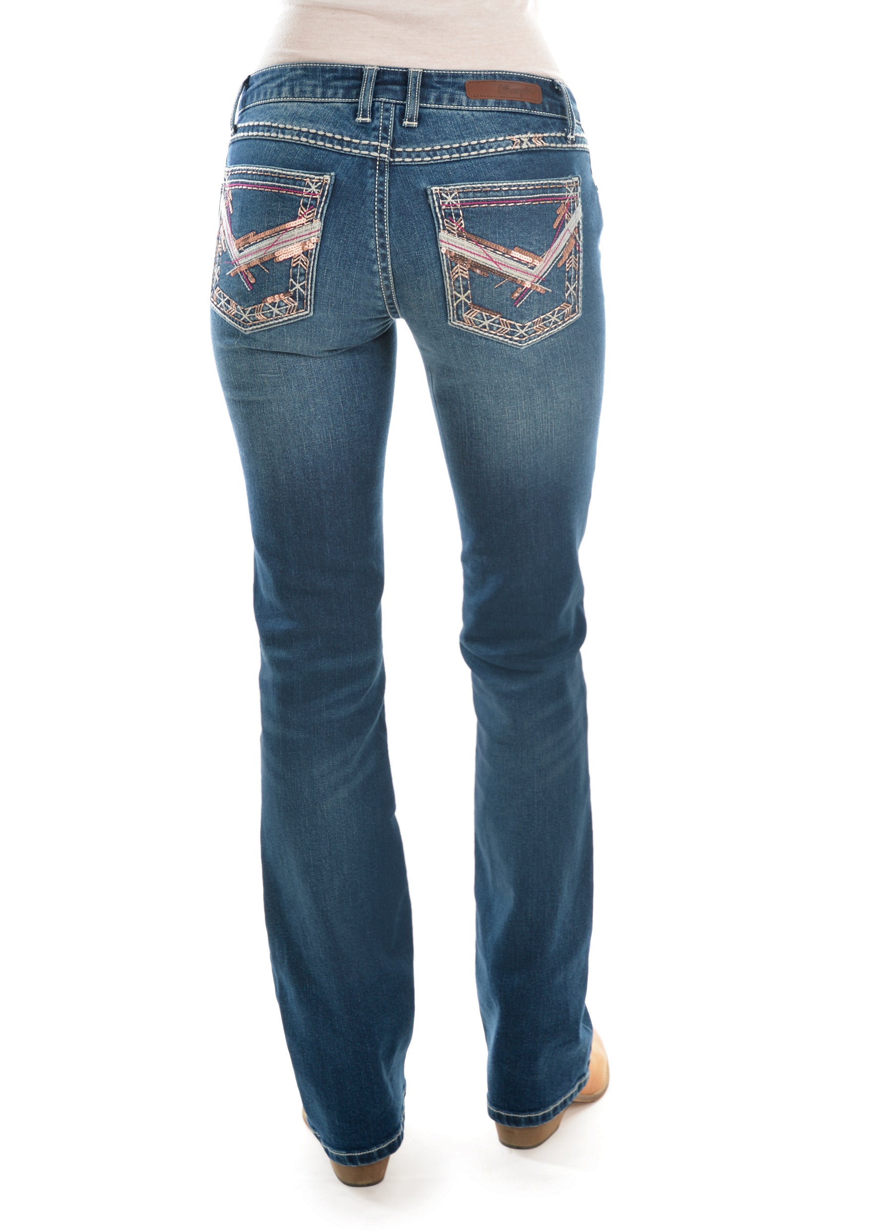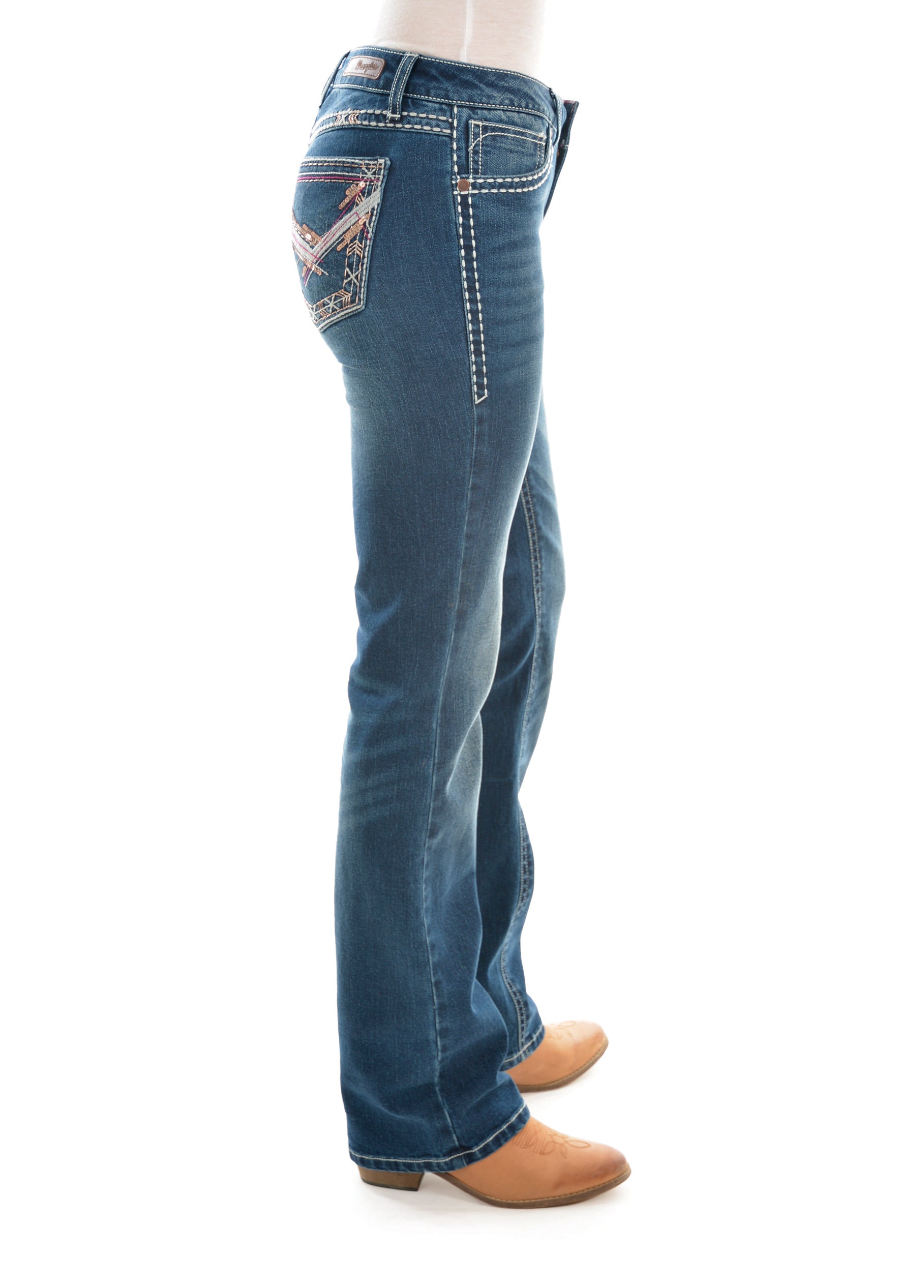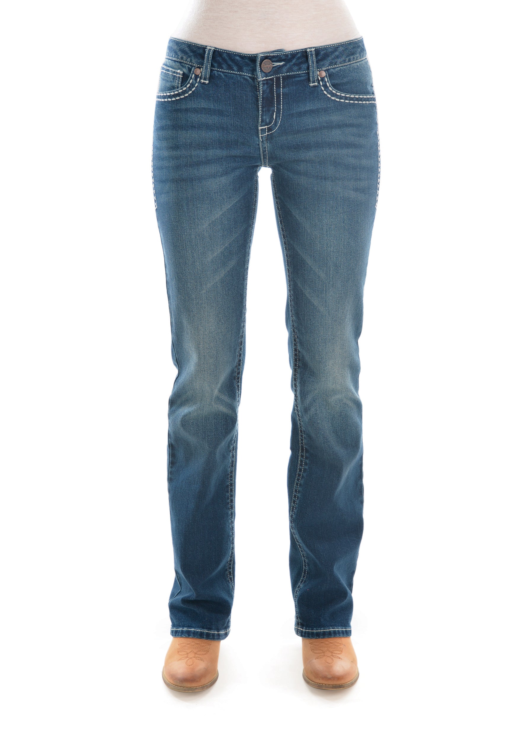 Relaxed boot cut - 34 Inch leg, five pocket styling, back pockets with feature embroidery & embellishments, all over feature stitching, logo rivets at stress points
