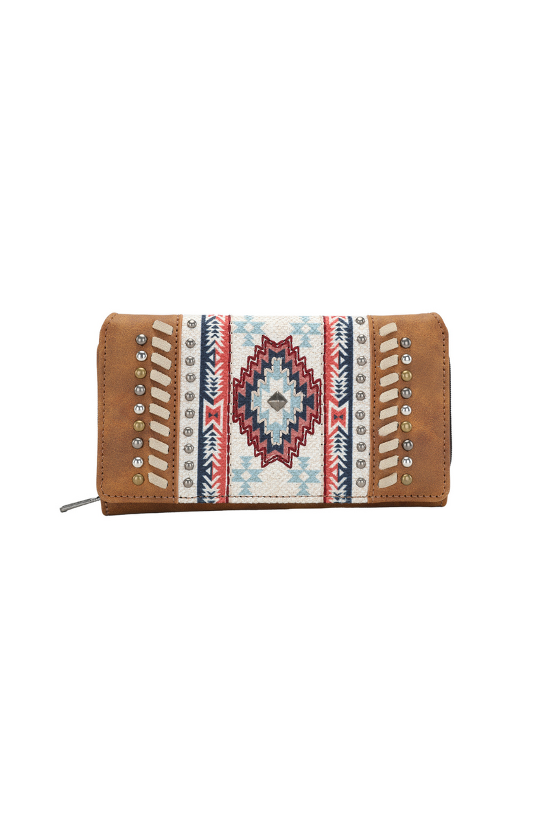 Carry your cash in style with this Wrangler Carmen Wallet. The aztec pattern adds a touch of flair to this wallet style, inspired by the iconic carmen bag. Functional and fashionable, this wallet will keep your money organized and make a statement.
